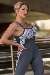 Adicione um toque de elegância e modernidade à sua rotina de exercícios com este macacão fitness de design único. Predominantemente em cinza chumbo, a peça apresenta recortes estratégicos com uma estampa camuflada em tons de azul claro, branco e cinza, que se destacam na parte superior do busto e em uma faixa lateral que desce pela perna. A parte superior, estilo top com alças, possui detalhes em argolas na frente, adicionando um charme especial. Nas costas, o macacão conta com um decote vazado que confere um toque de sofisticação e estilo. A modelagem ajustada ao corpo realça a silhueta e proporciona total conforto e liberdade de movimento, sendo perfeita para qualquer atividade física ou para um visual atlético e estiloso.