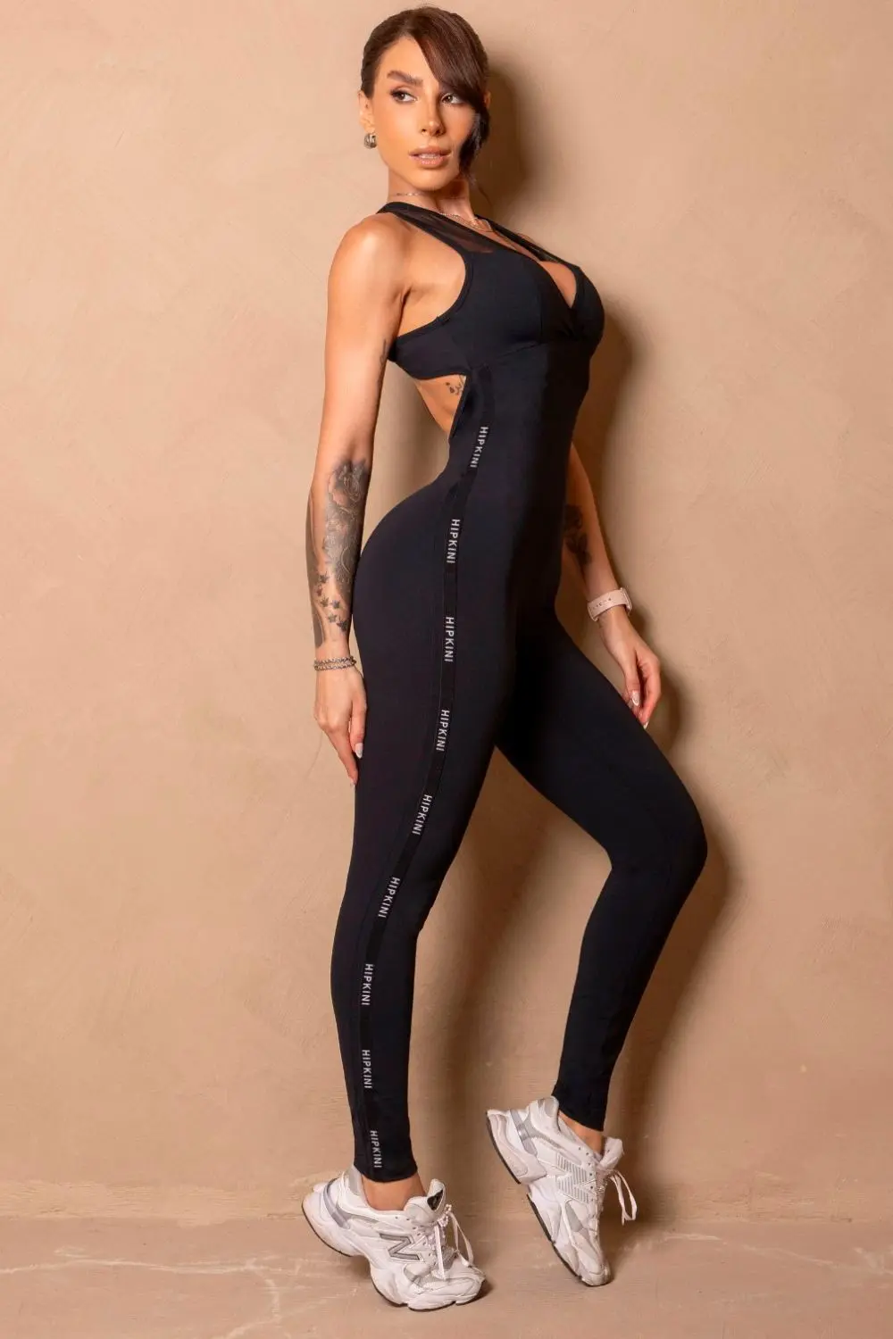 Macacão fitness de alças cruzadas nas costas, confeccionado em tecido de alta compressão que valoriza a silhueta. Possui recorte em tule no decote para um toque moderno e respirável, garantindo conforto e estilo durante os treinos.