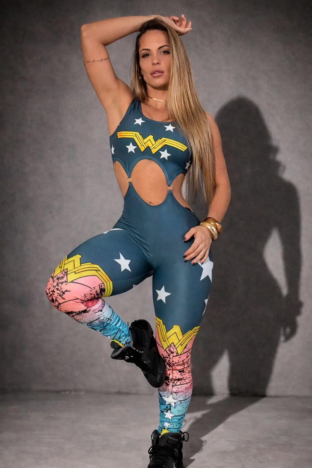 Macacão fitness com estampa exclusiva inspirada em heroína, com referências à Mulher-Maravilha, combinando estrelas e grafismos icônicos em tons de azul petróleo, amarelo e detalhes em rosa e azul claro. A modelagem ajustada valoriza a silhueta, com recortes estratégicos na cintura e argolas laterais que trazem um visual moderno e ousado. Confeccionado em tecido de alta elasticidade, oferece conforto, liberdade de movimento e impacto visual marcante.