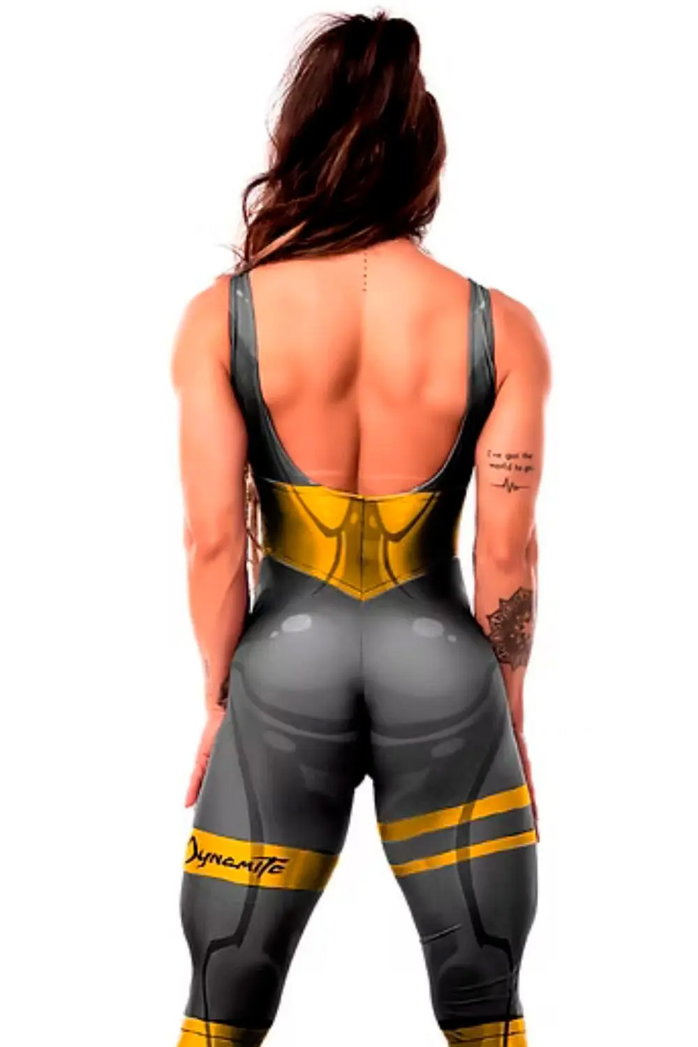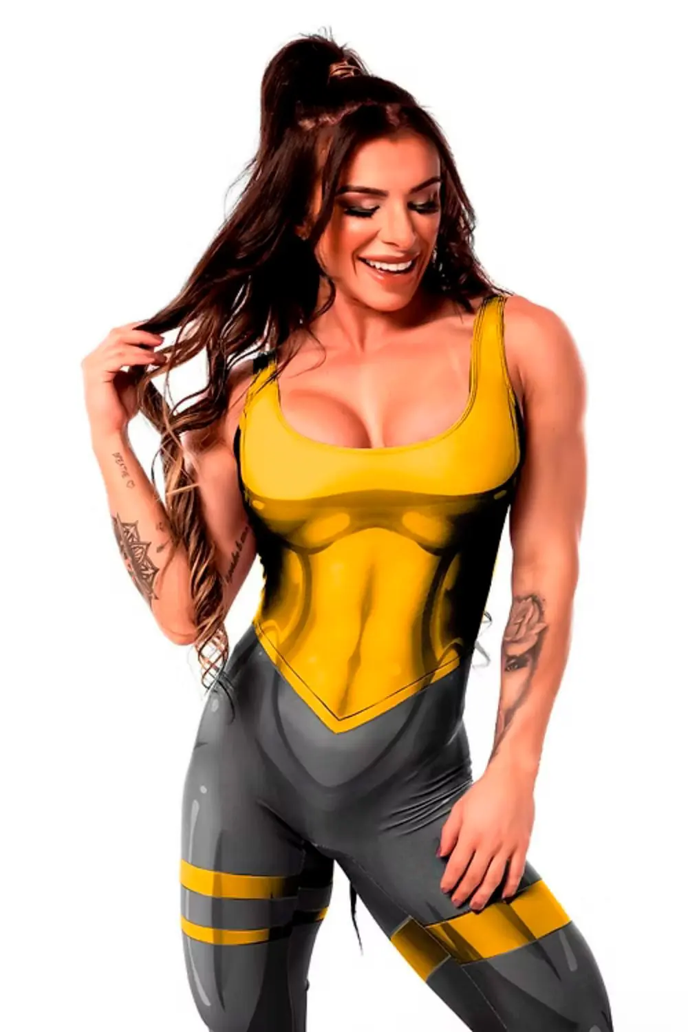 O Macacão Fitness Mercúrio Black Golden traz a estampa original com efeito 3D que modela a silhueta com elegância, destacando a beleza feminina em qualquer movimento