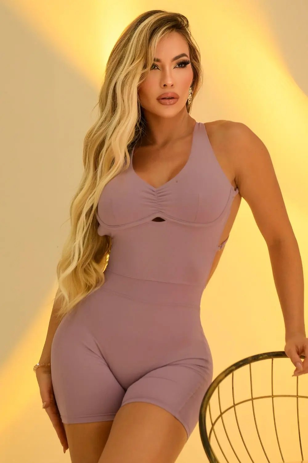 O macaquinho é confeccionado em tecido justo e elástico, modelando a silhueta. Possui decote em “V” com franzido discreto no busto e alças finas que se cruzam nas costas, deixando a parte traseira quase totalmente aberta. A cintura é marcada pela própria modelagem, que alonga e valoriza a forma do corpo, conferindo um visual minimalista e sofisticado.