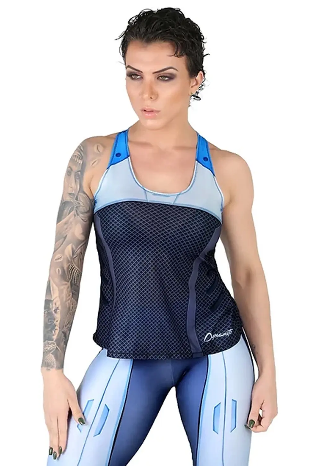 Descrição: Uma regata fitness com estampa gráfica em preto e azul com design robótico.