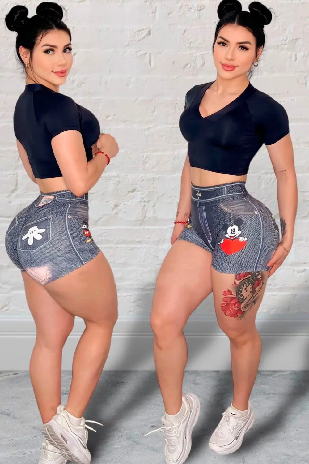Shorts modelo "Mickey" na cor fake jeans Black ,com cós alto e modelagem super cavada que valoriza as curvas. Possui detalhes gráficos que imitam bolsos e costuras, trazendo um toque divertido e retrô à peça. Tecido com compressão moderada e elasticidade ideal para treinos ou looks casuais com atitude.