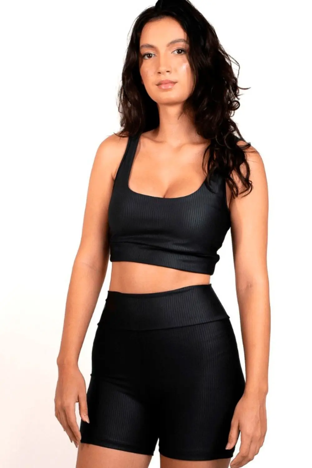 Shorts fitness na cor preto, de cintura alta. Feito em tecido canelado com elasticidade e ótimo caimento, oferece conforto e sustentação para treinos leves a moderados. Ideal para quem busca estilo e praticidade no dia a dia.