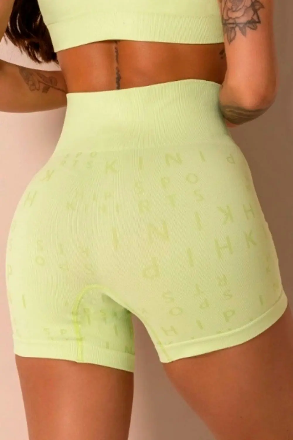 Shorts Fitness Seamless Verde com escrito Hipkini no cós. Com tecnologia seamless possui visual contemporâneo com superfície personalizada com a nossa logo, contrastando com o cós levemente canelado com assinatura Hipkini