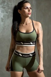 Características: Short fitness verde. Acabamentos em preto na lateral das pernas. Possui cós preto com silk branco para detalhamentos.