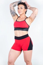Características: Short fitness vermelho. Acabamentos em preto na lateral das pernas. Possui cós preto e silk branco para detalhamentos.