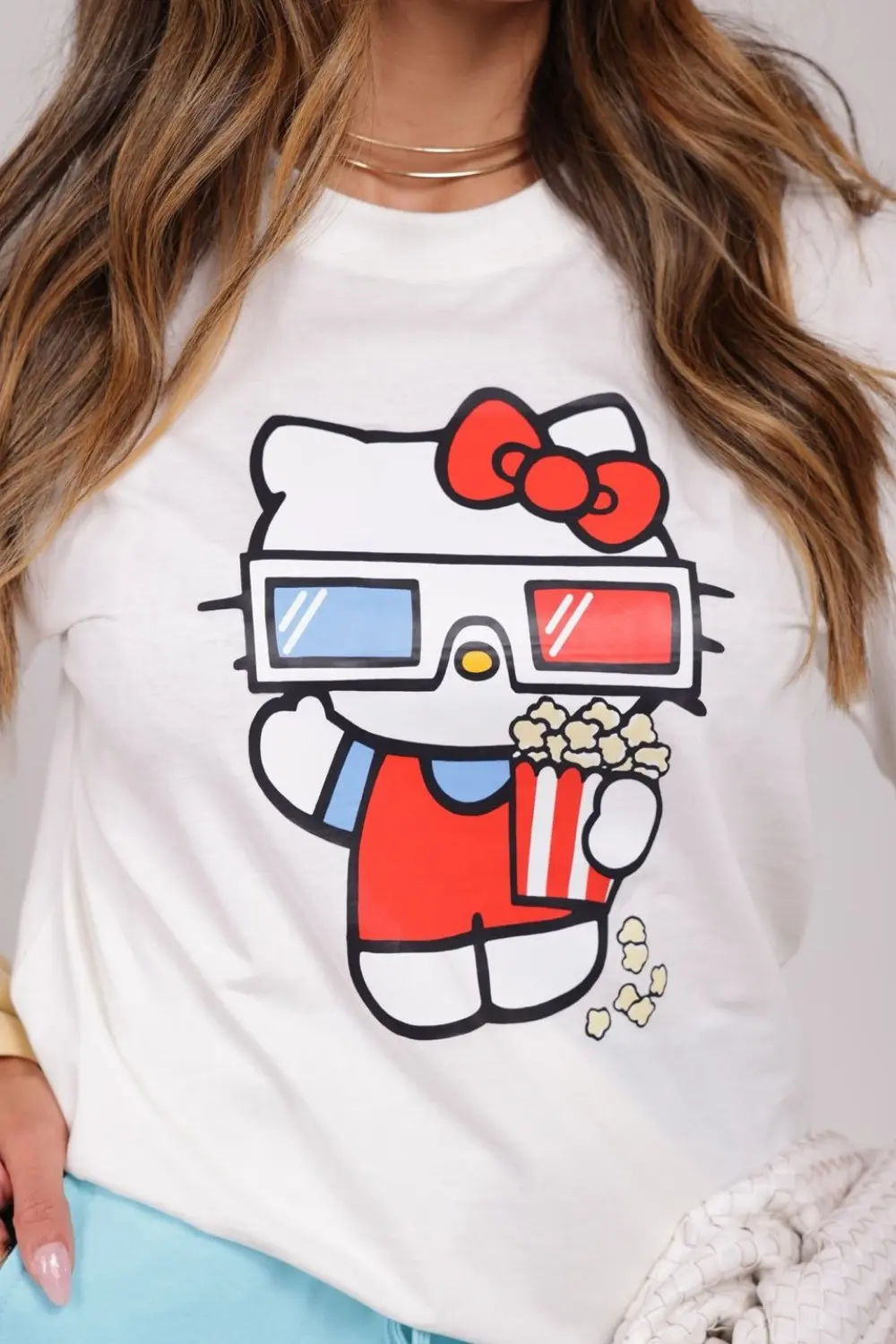 T-shirt branca em algodão, com estampa frontal da personagem Hello Kitty usando óculos 3D e segurando um balde de pipoca. A modelagem é reta e confortável, ideal para compor looks casuais com um toque divertido e moderno.