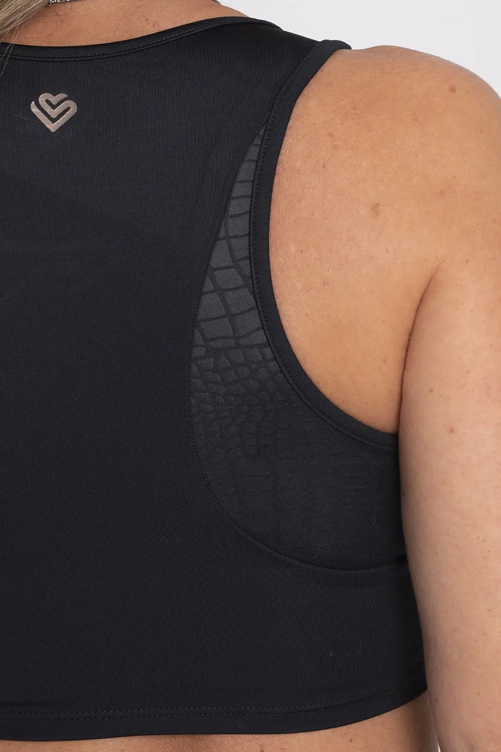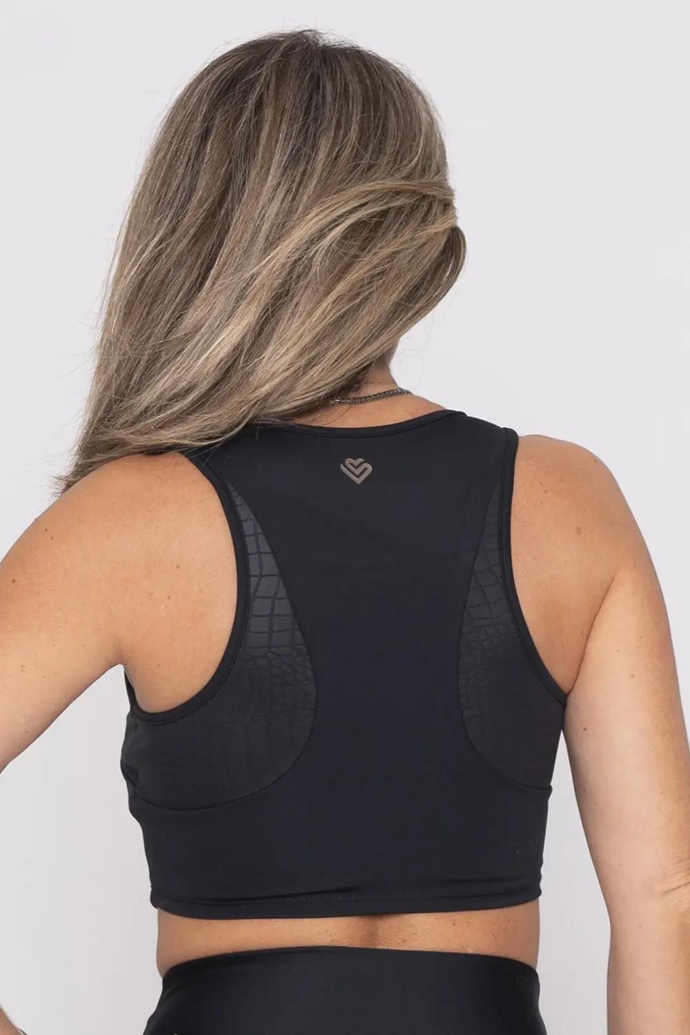 Top fitness preto com costas nadador, garantindo conforto e sustentação durante atividades físicas. Possui detalhes texturizados nas laterais, conferindo um toque moderno e elegante ao design. Confeccionado em tecido elástico e respirável, é perfeito para treinos ou composições casuais esportivas. Discreto e funcional, combina estilo e praticidade.