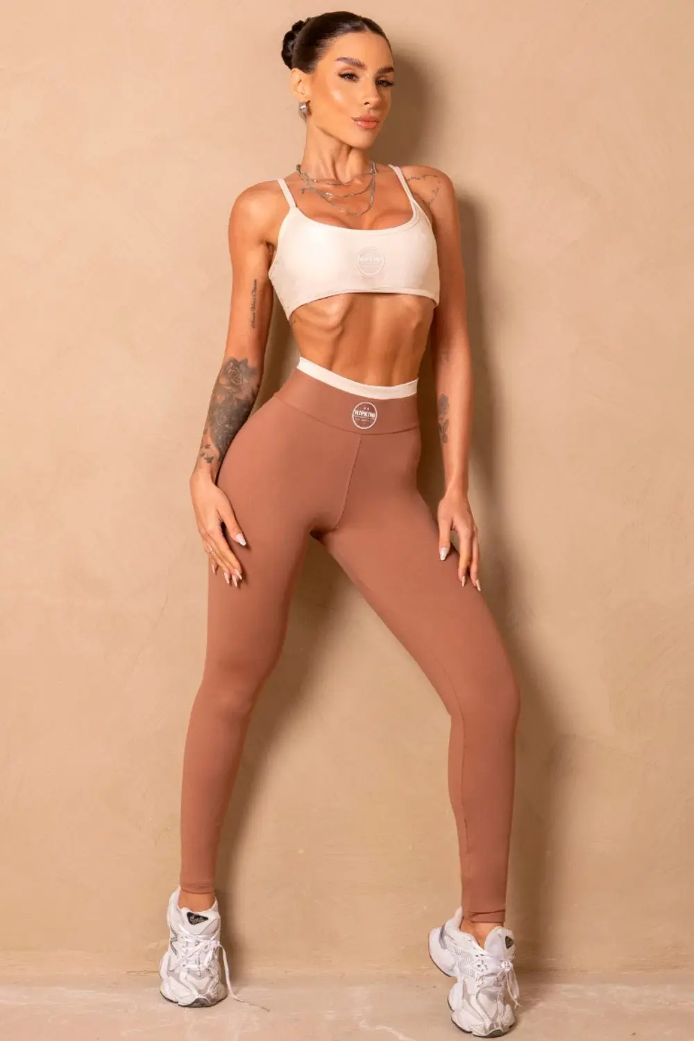 Top bege com decote arredondado e alças finas reguláveis. Confeccionado em tecido liso de alta sustentação, oferece conforto e segurança durante os treinos. Estampa frontal "HIPKINI" aplicada no centro. Design versátil e moderno para compor looks fitness com estilo.