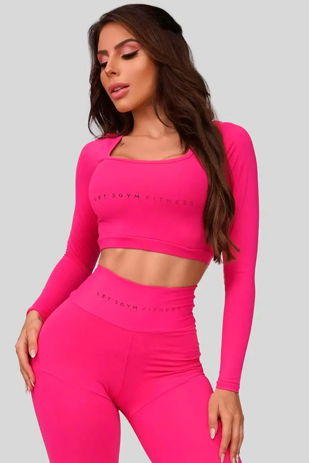 Top cropped com bojo em tecido de alta compressão e elasticidade, ideal para treinos e atividades físicas. Possui mangas longas, modelagem ajustada ao corpo e decote quadrado que valoriza o busto. Estampa discreta “LET’S GYM FITNESS” no centro. Perfeito para quem busca estilo e performance na academia.