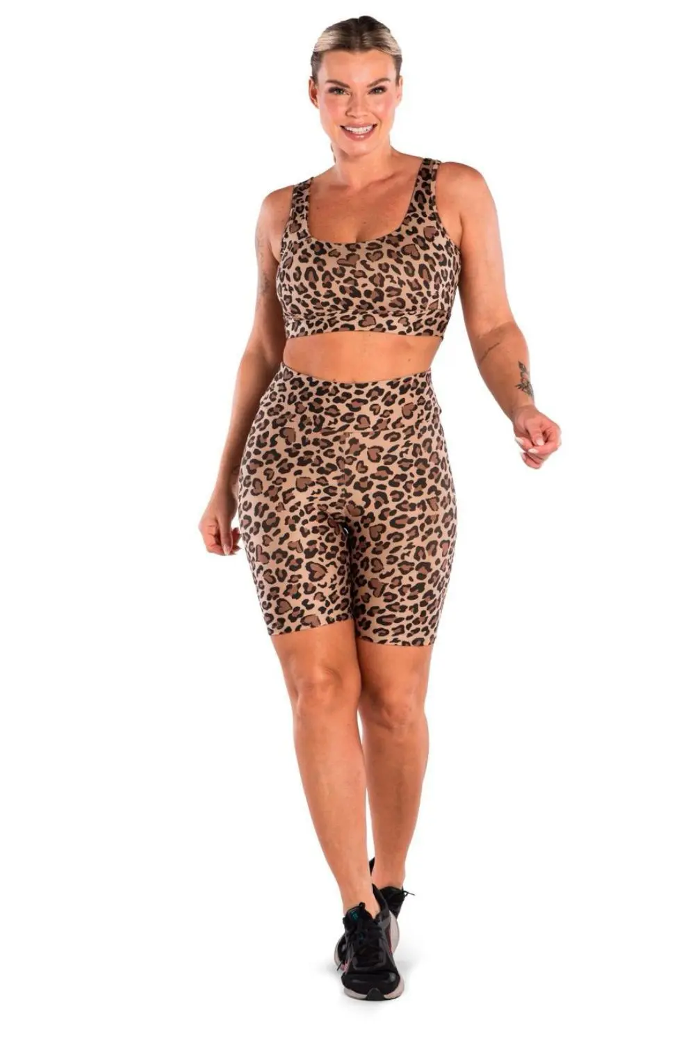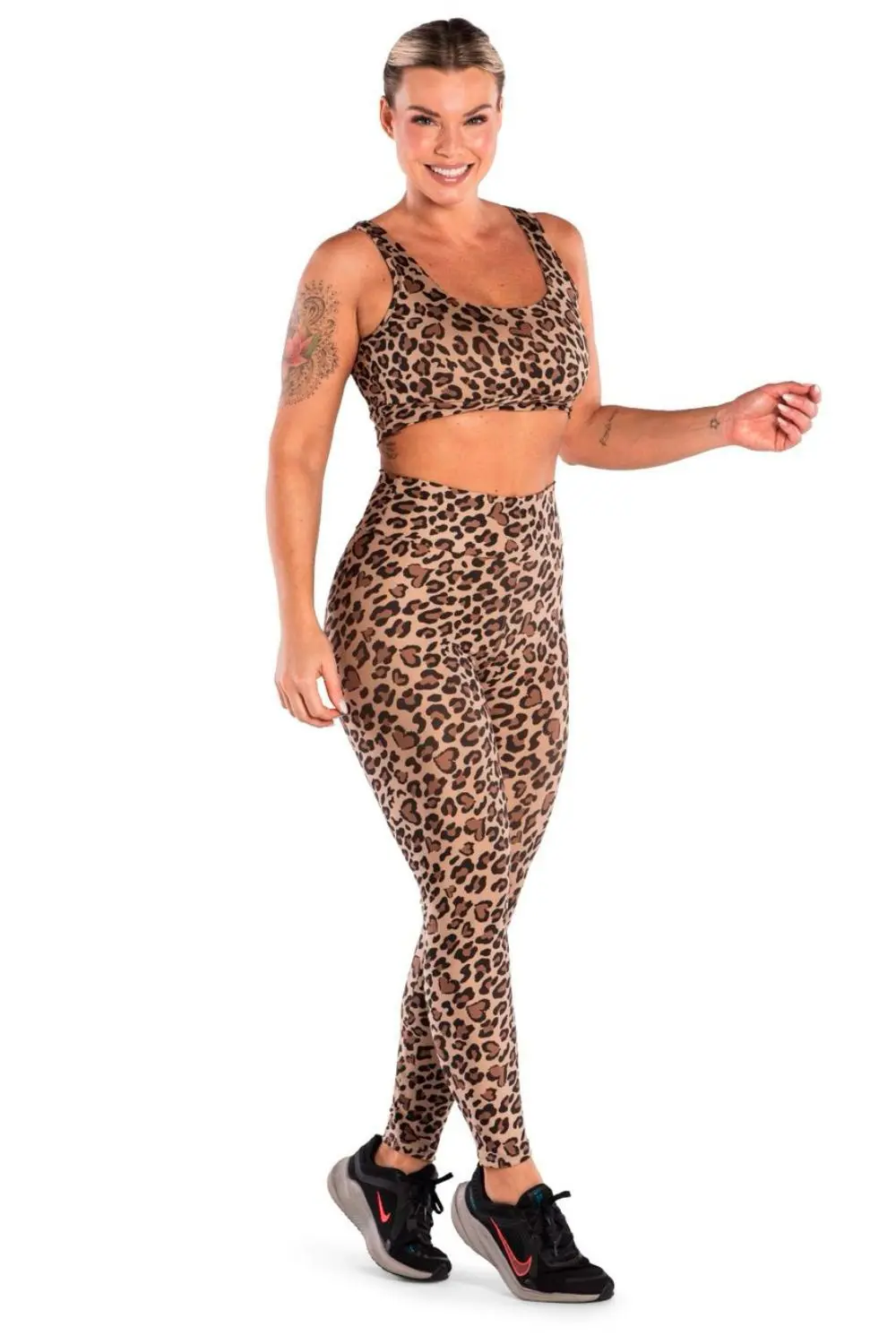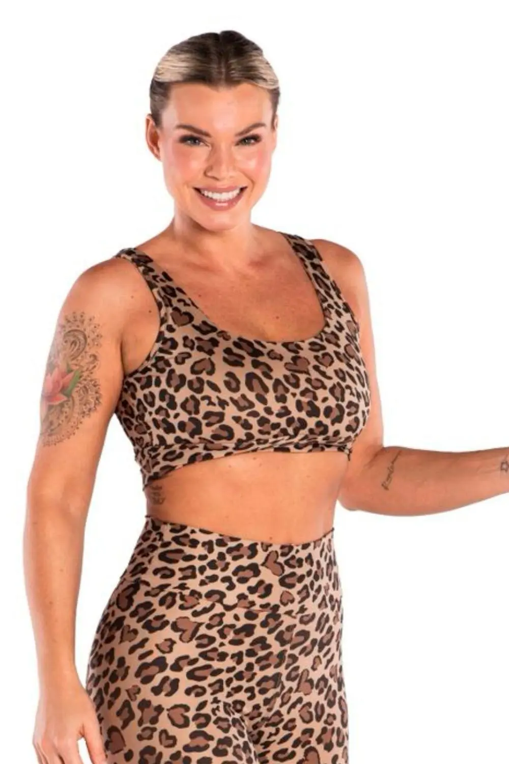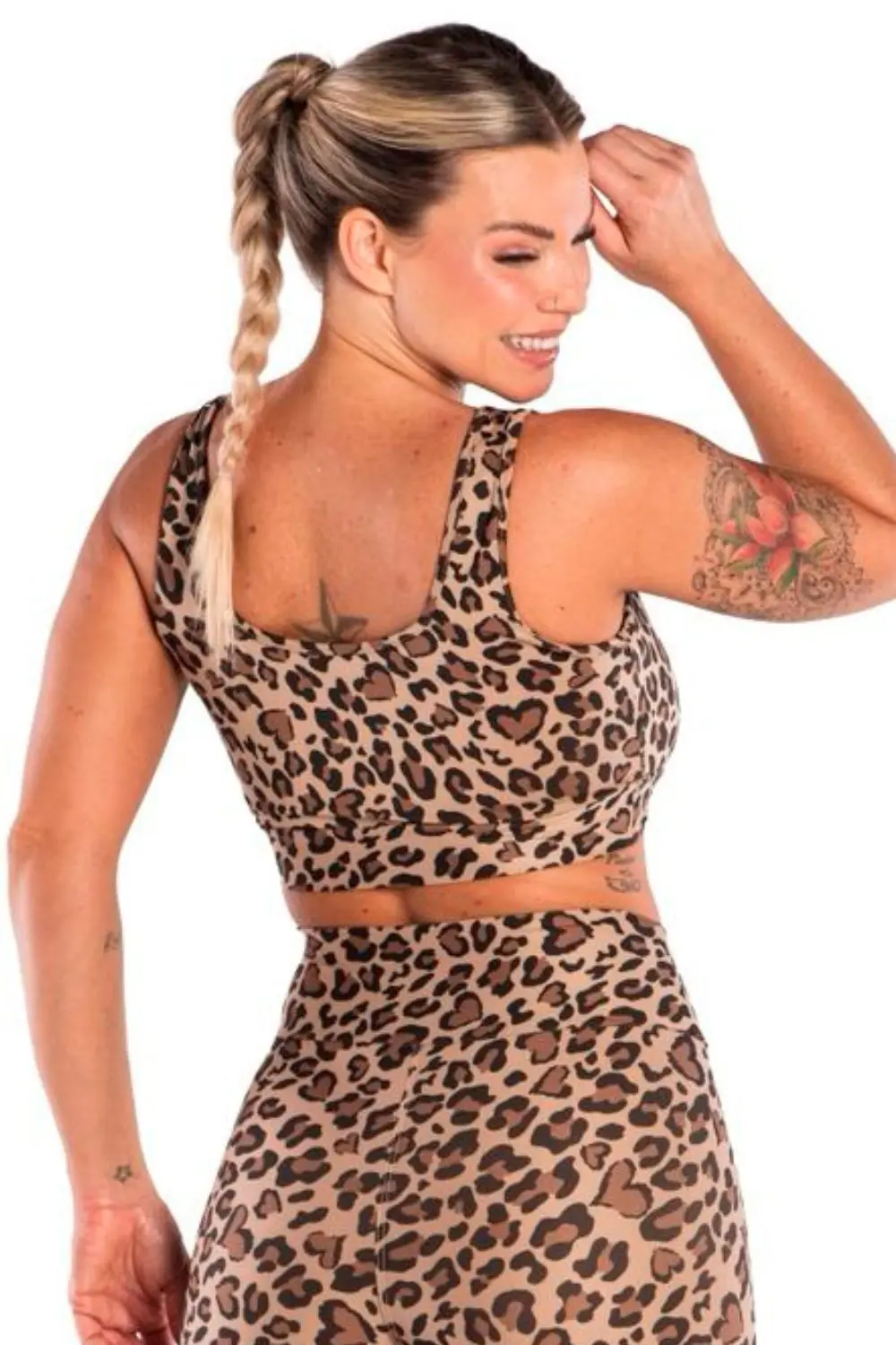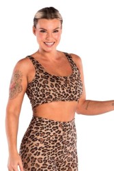 Top fitness com estampa animal print, modelagem justa e alças largas que garantem sustentação e estilo nos treinos ou no dia a dia.