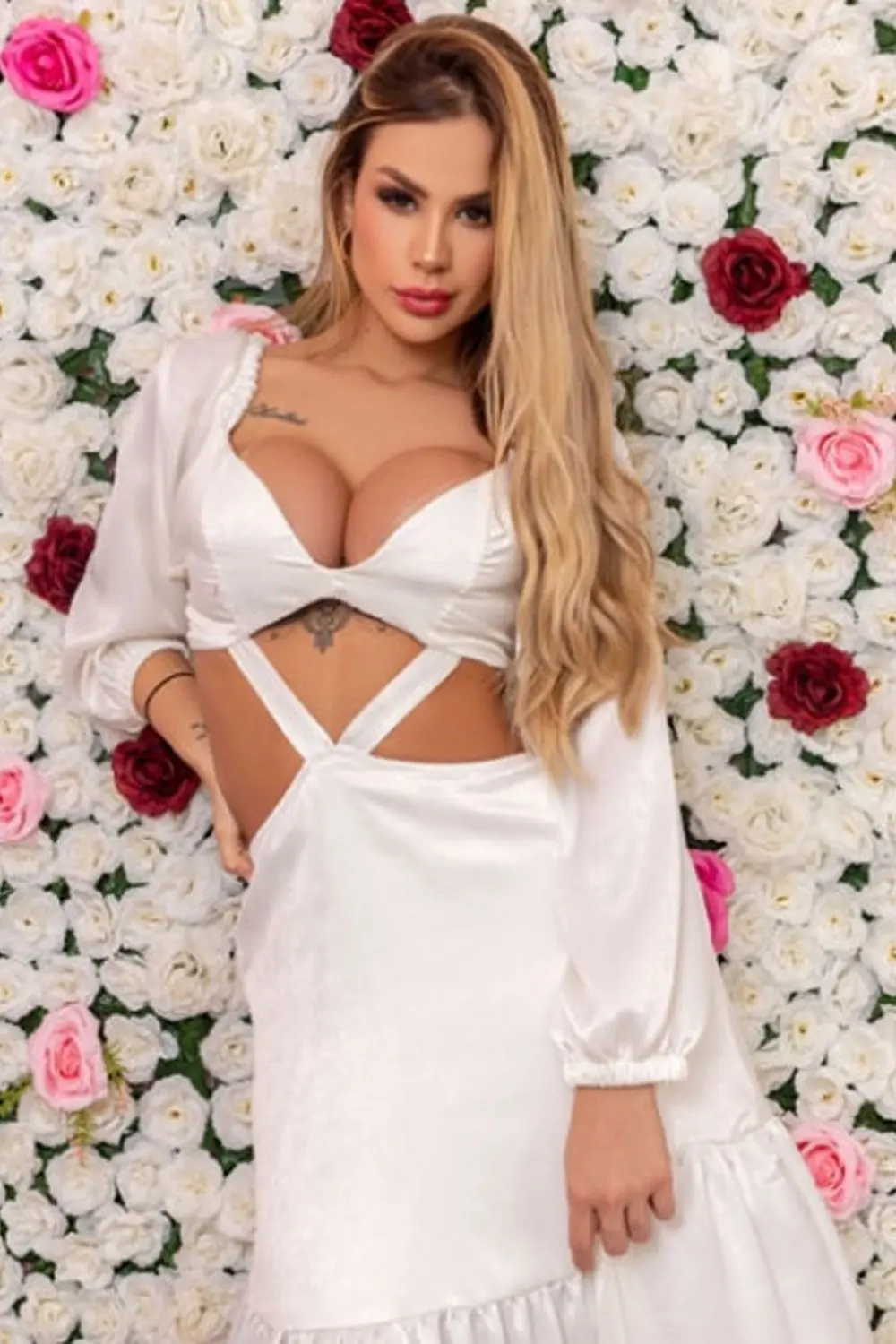 Características: Vestido longo em tecido leve, com mangas longas e recortes vazados, amarração nas costas.