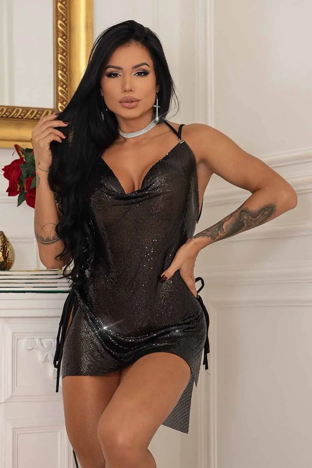 Apresentando o melhor vestido de festa - nosso modelo preto com uma textura brilhante e atraente que terá todos os olhos em você! Este vestido é projetado para fazer uma declaração, com seu estilo "frente única" que é ousado e elegante. O decote redondo dá um toque de sofisticação, enquanto o tecido brilhante cria um efeito lúdico e glamoroso, perfeito para qualquer ocasião especial. Esteja você na pista de dança ou participando de uma festa de coquetéis, este vestido fará você se sentir confiante e chique a noite toda. Então, por que se contentar com um vestidinho preto chato quando você pode ter essa beleza de parar o show?