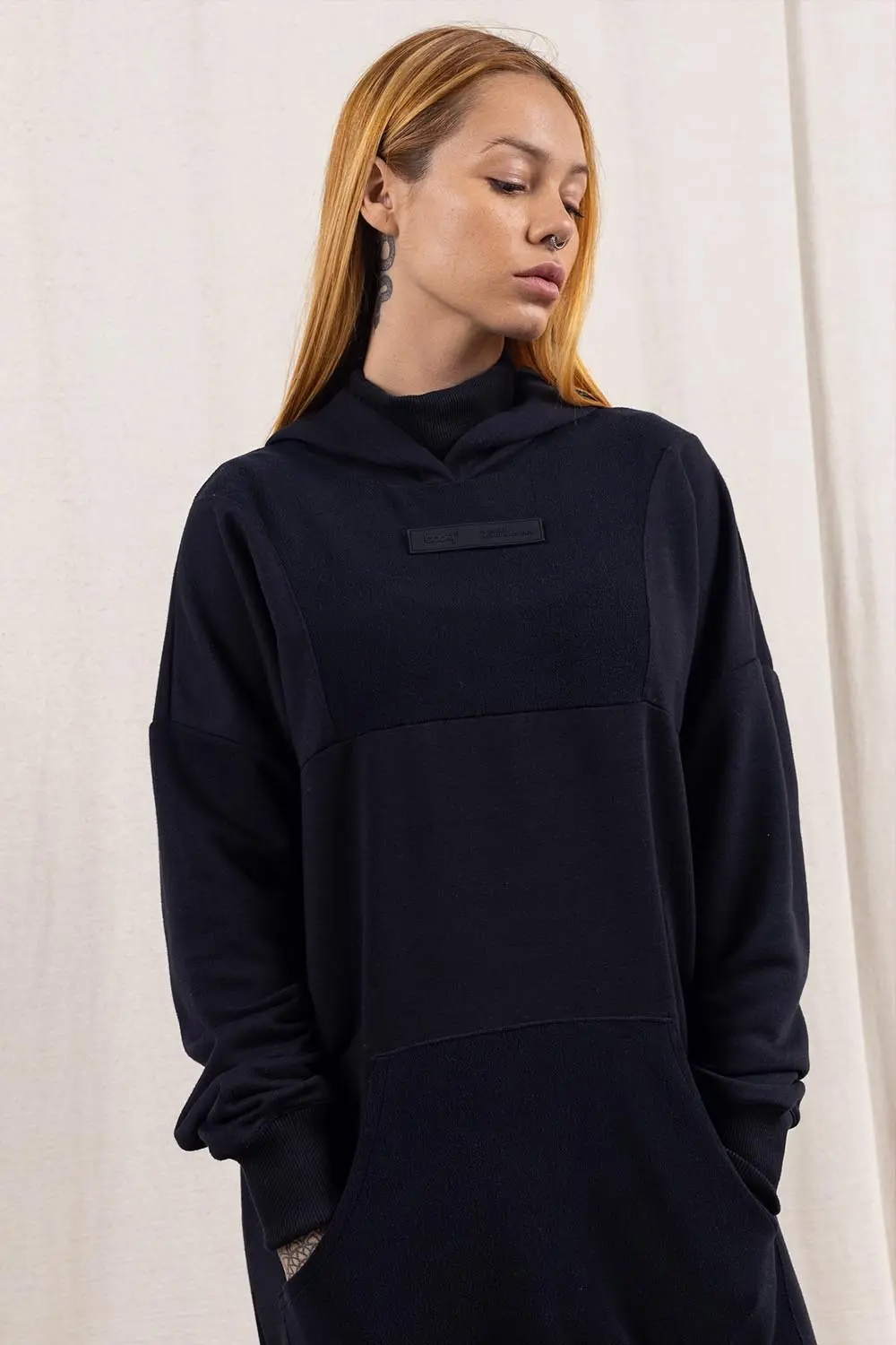 Intensifique seu jogo de moda com este vestido com capuz moderno e versátil em preto. É a mistura perfeita de conforto e estilo, combinando a vibração descontraída de um moletom com a elegância de um vestido. O vestido possui mangas compridas para mantê-la confortável e uma pequena etiqueta de borracha na frente, adicionando um toque cool e contemporâneo.