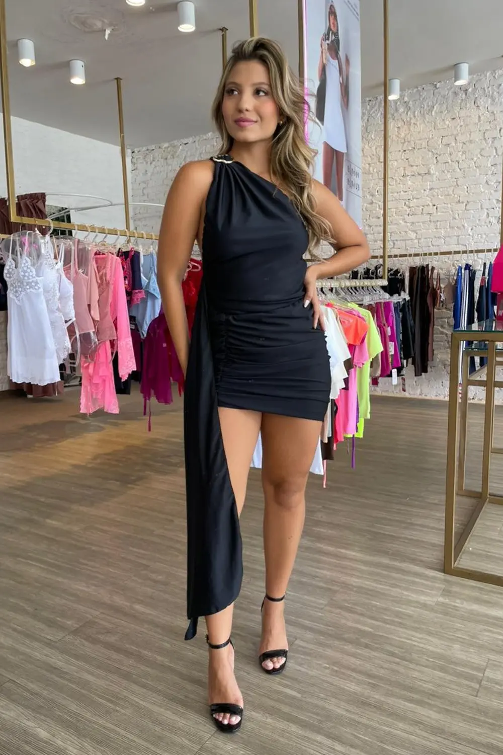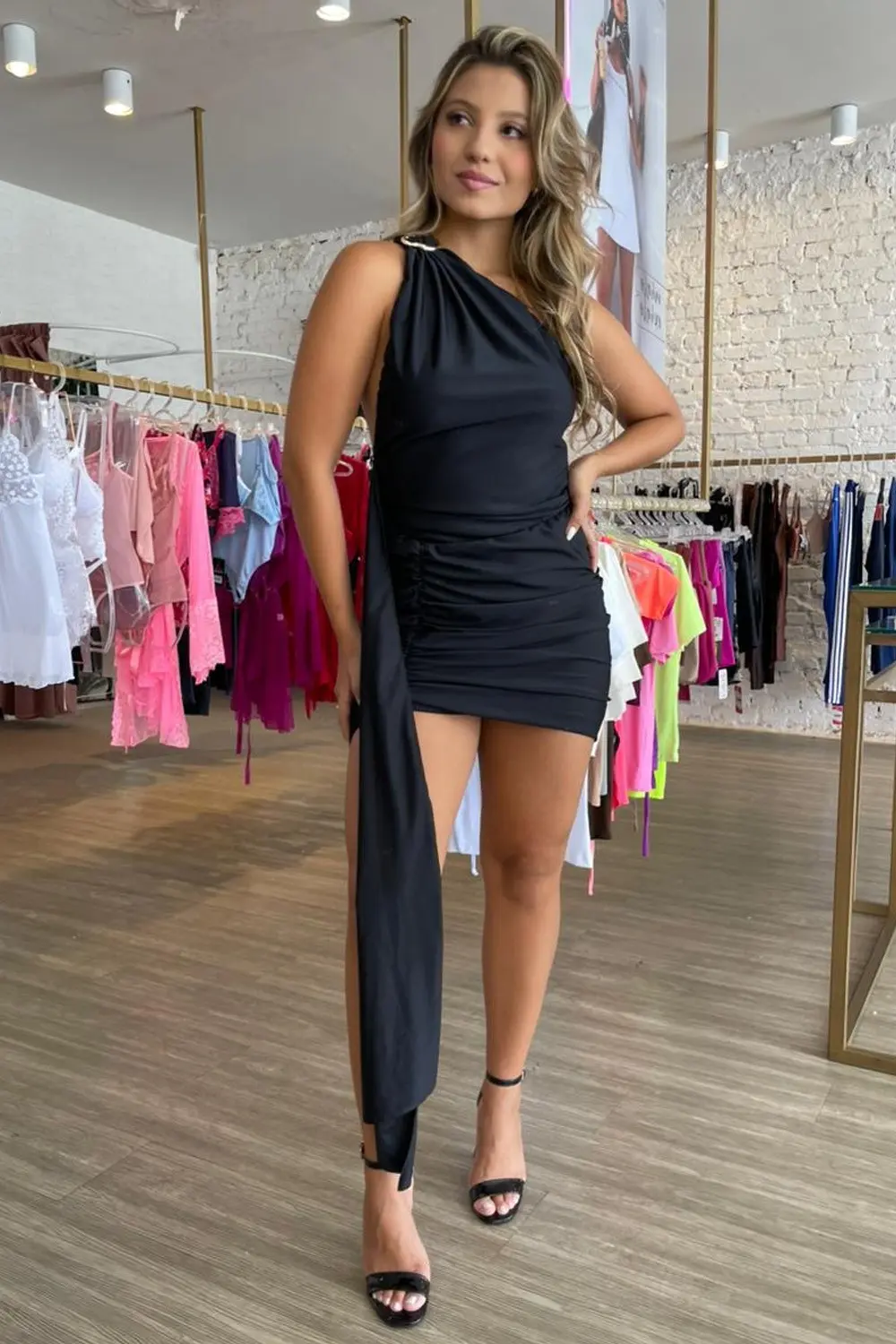 Este vestido é curto, com um design assimétrico de um ombro só e um detalhe de tecido longo que desce lateralmente, adicionando movimento e sofisticação ao look. Feito em um tecido preto liso, o vestido apresenta drapeados ao longo da parte frontal e lateral, destacando a silhueta com elegância.