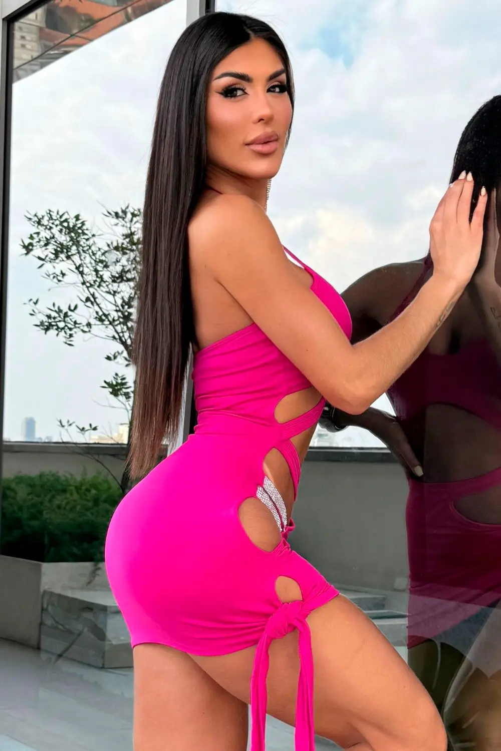 Vestido curto em tom vibrante, com design recortado que destaca a cintura e as curvas. Traz laterais abertas, detalhe com brilho aplicado e amarração que permite ajuste perfeito. Peça marcante, criada para produções modernas e cheias de atitude.