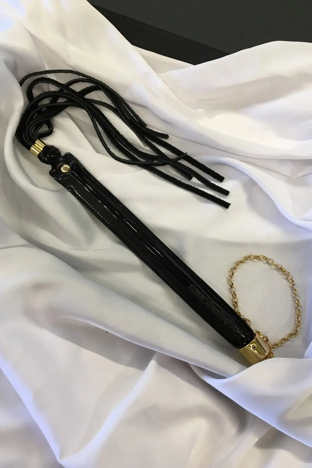 Characteristics: Leather erotic whip. Made of faux leather and leather lining. Gold plated metal accents, fringes, gold chain to hold.