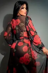 Long beach cover-up in lightweight, sheer fabric with a red rose print that exudes sophistication and sensuality. Flowing design with a front tie, perfect for creating elegant and striking looks by the sea or pool.
