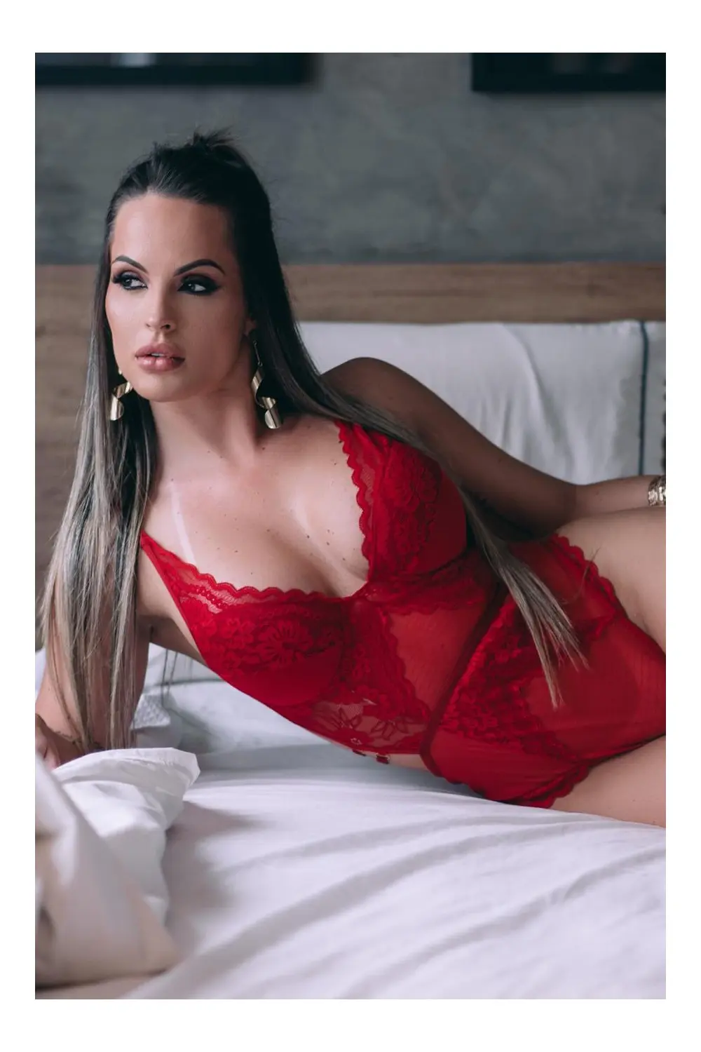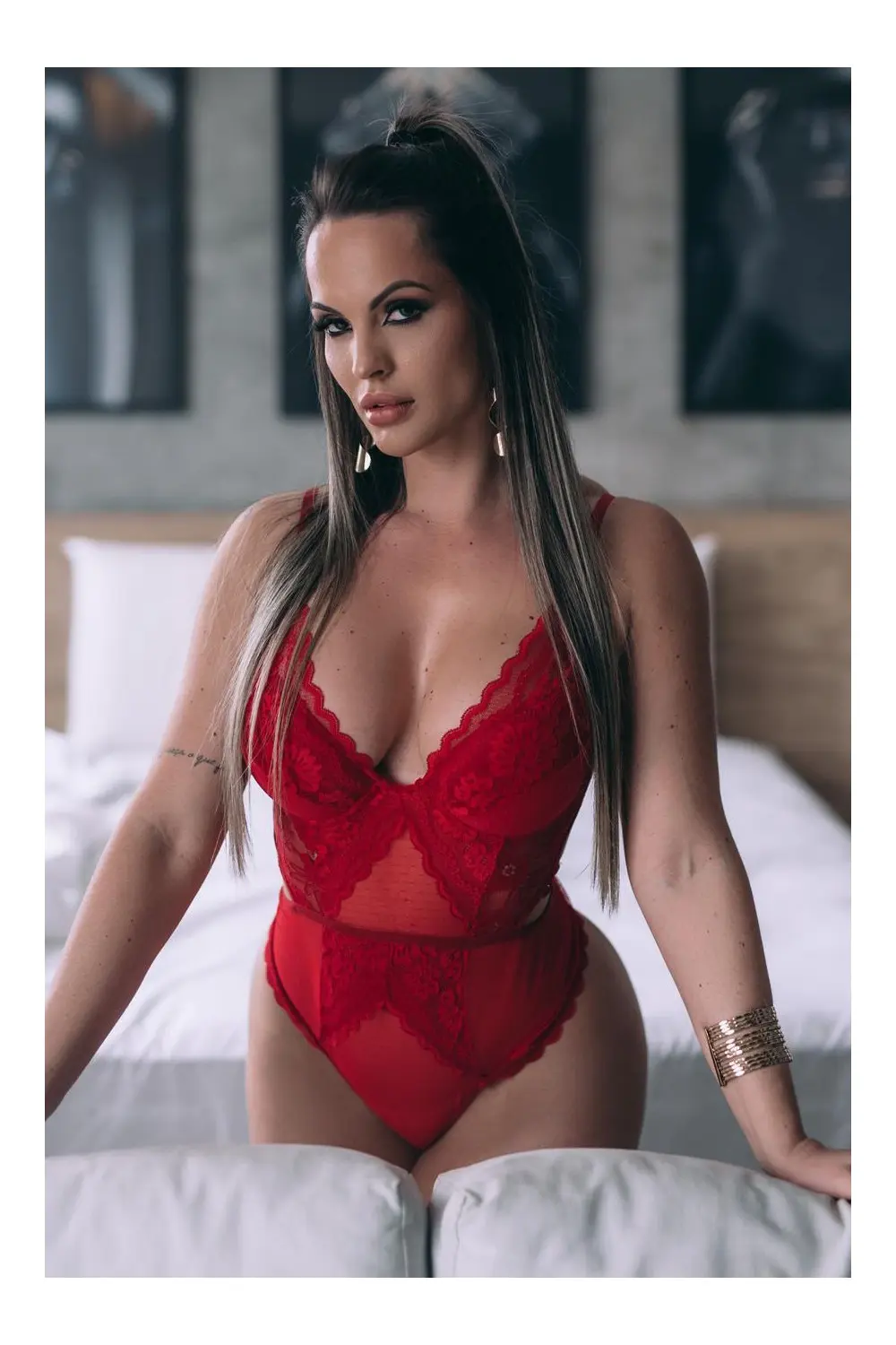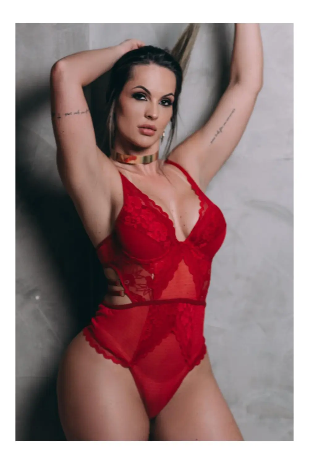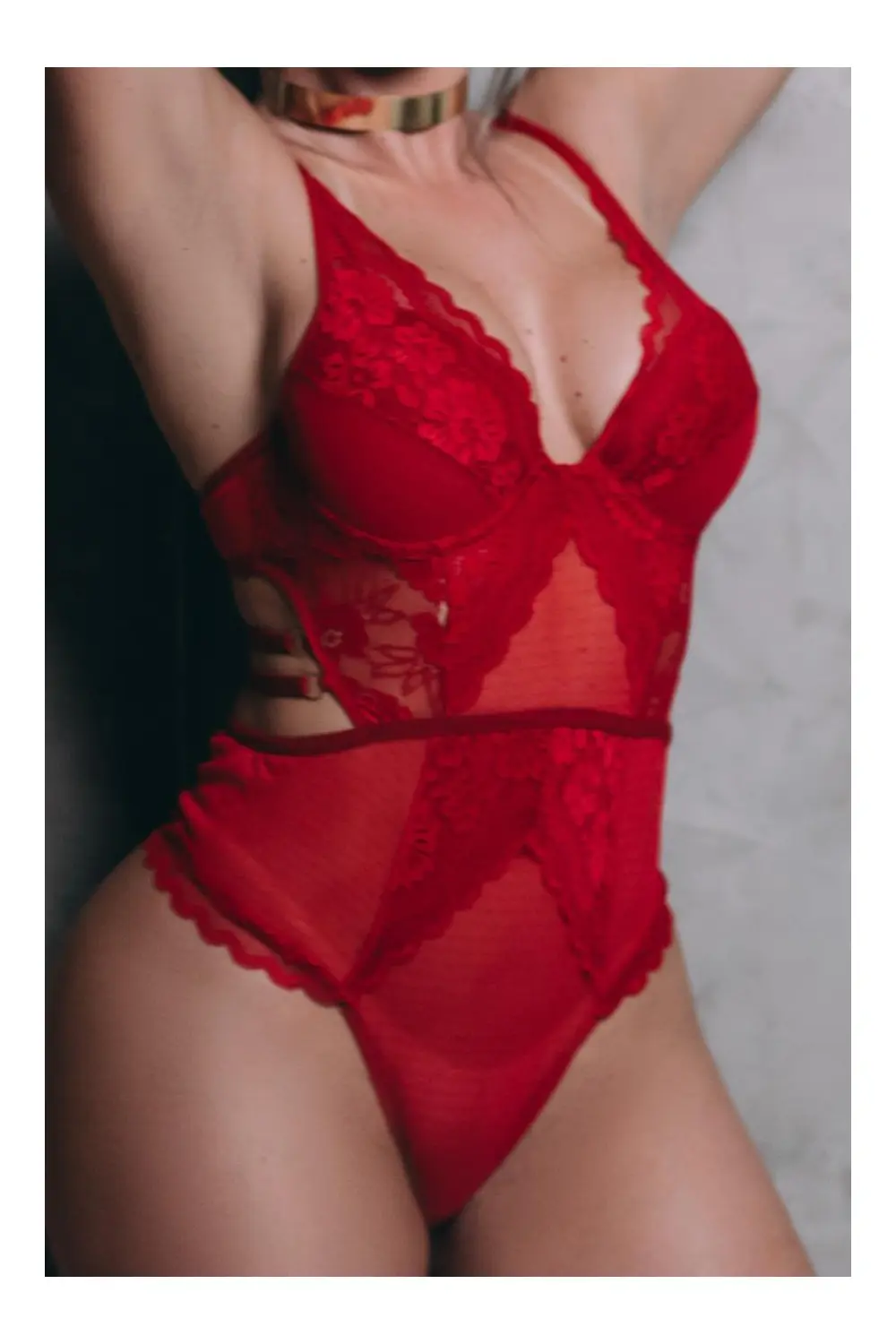 Red lingerie bodysuit made of lace and sheer fabric. The piece has sensual cutouts on the sides and floral lace details on the bust and abdomen. The straps are thin and there are strap details on the sides that accentuate the waist. The sheer fabric in the central areas gives a bold touch, while the lace adds elegance and delicacy to the design. The metallic collar around the neck completes the look, bringing a modern and sophisticated contrast.