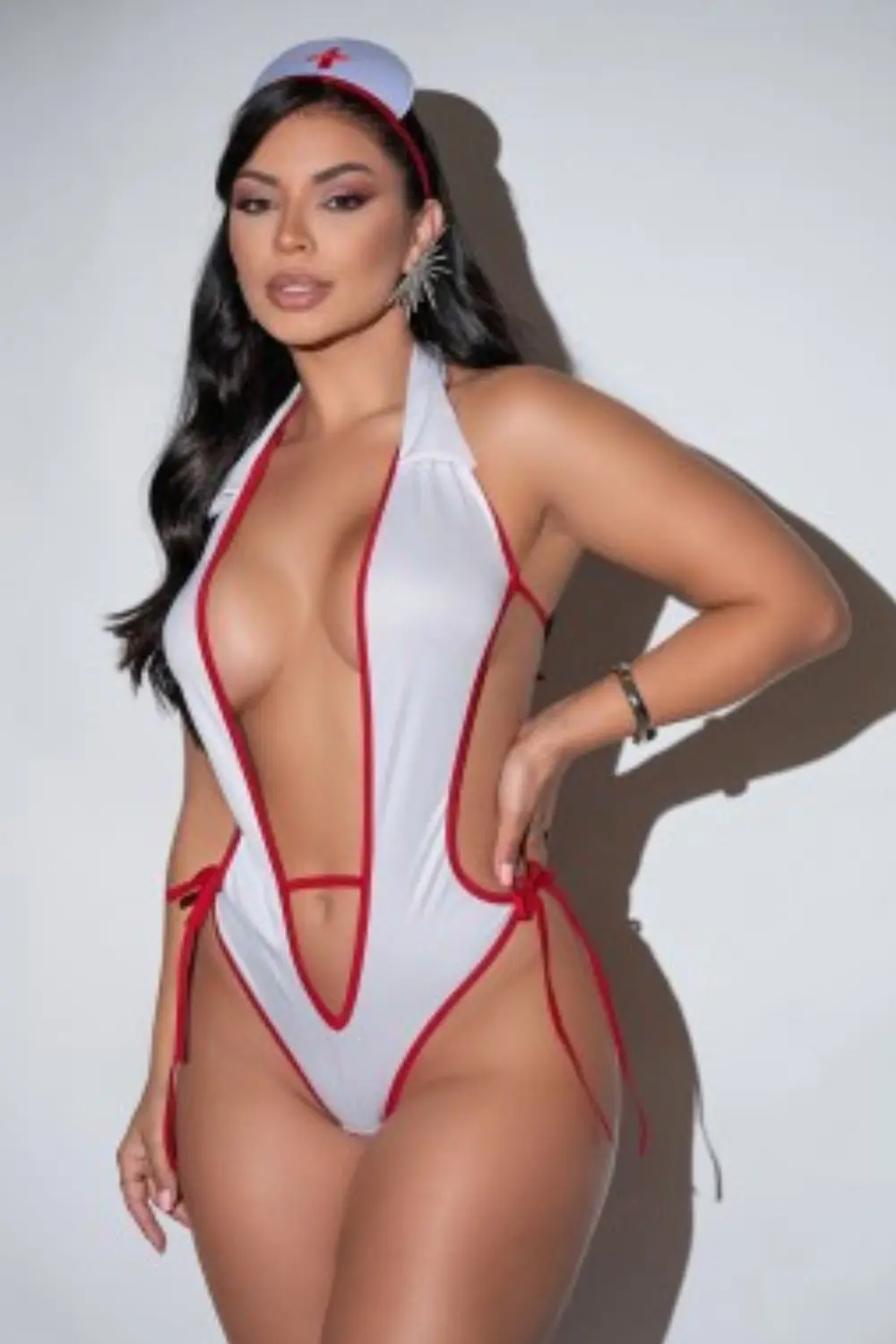 This themed lingerie is a bold and personality-filled piece, ideal for those seeking a provocative and fun look. Made of white fabric with red bias trim, it stands out for its deep cutouts on the front and sides, which enhance the body and create a striking visual effect. The style features ties on the sides and back, allowing for a perfect fit. The collar adds a distinctive touch to the design. The bottom features a thong design, ensuring sensuality and highlighting curves. A perfect choice for special moments with a touch of fantasy and seduction.