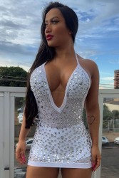 Features: A fashionable short white dress made in semi-transparent fabric with additional details in reflective square studs, a wide neckline and a pair of under shorts.