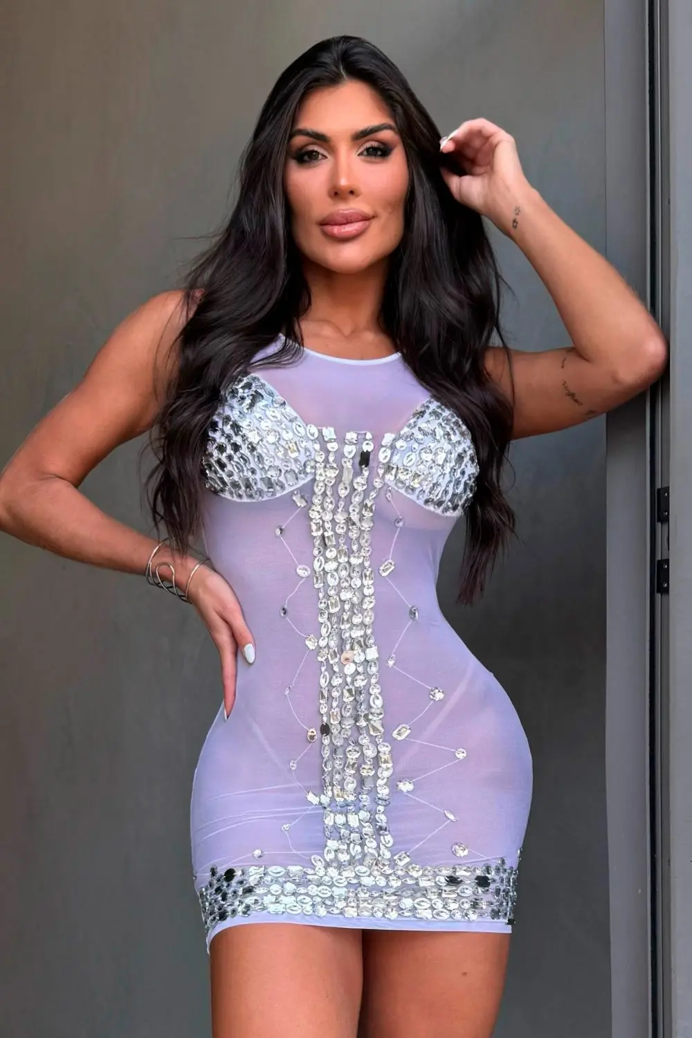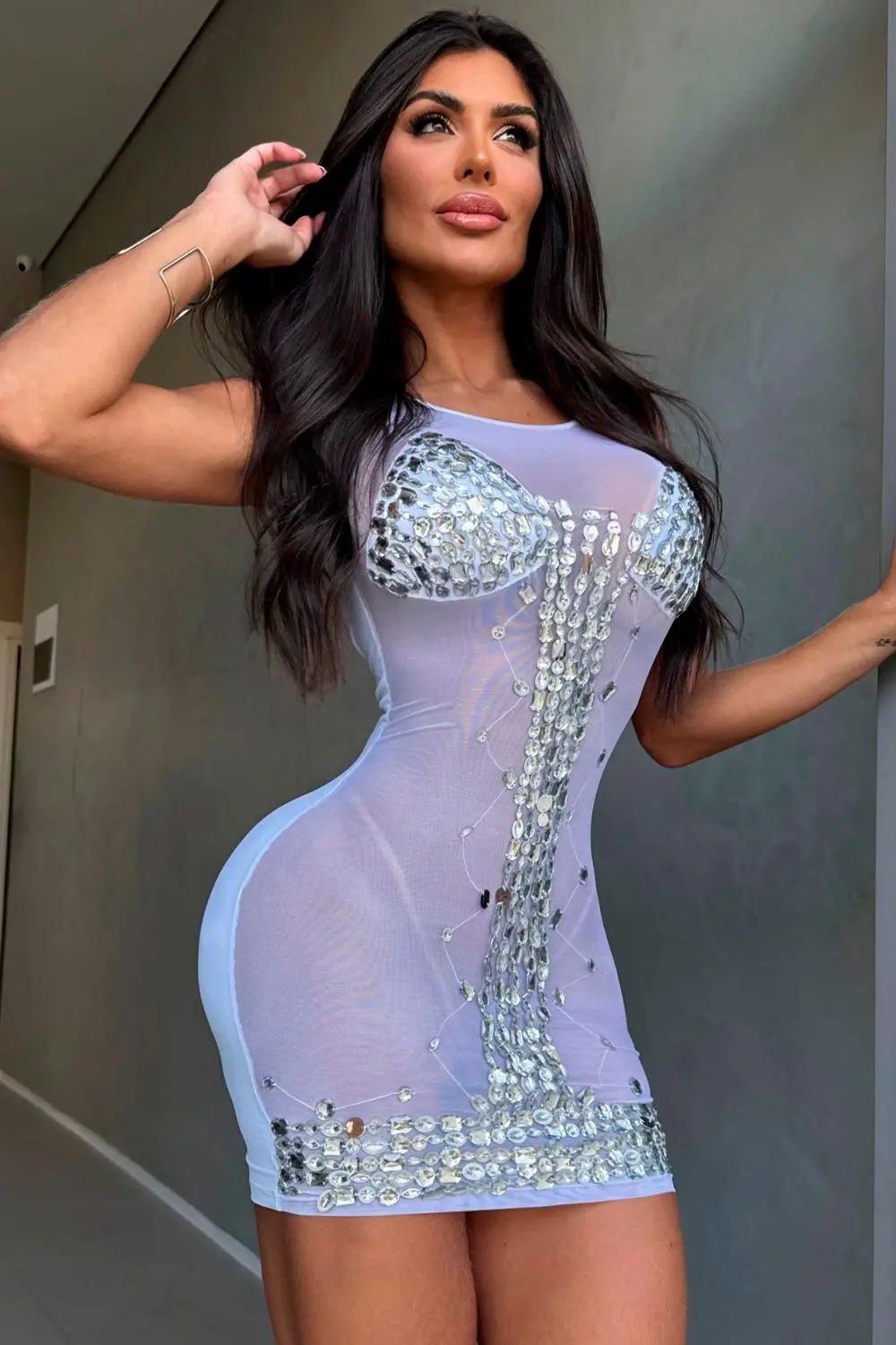 Short dress in sheer white tulle with glittering details. It features a low back and strategic cutouts that enhance the silhouette. Ideal for parties, nights out, or special occasions with a modern and bold touch.