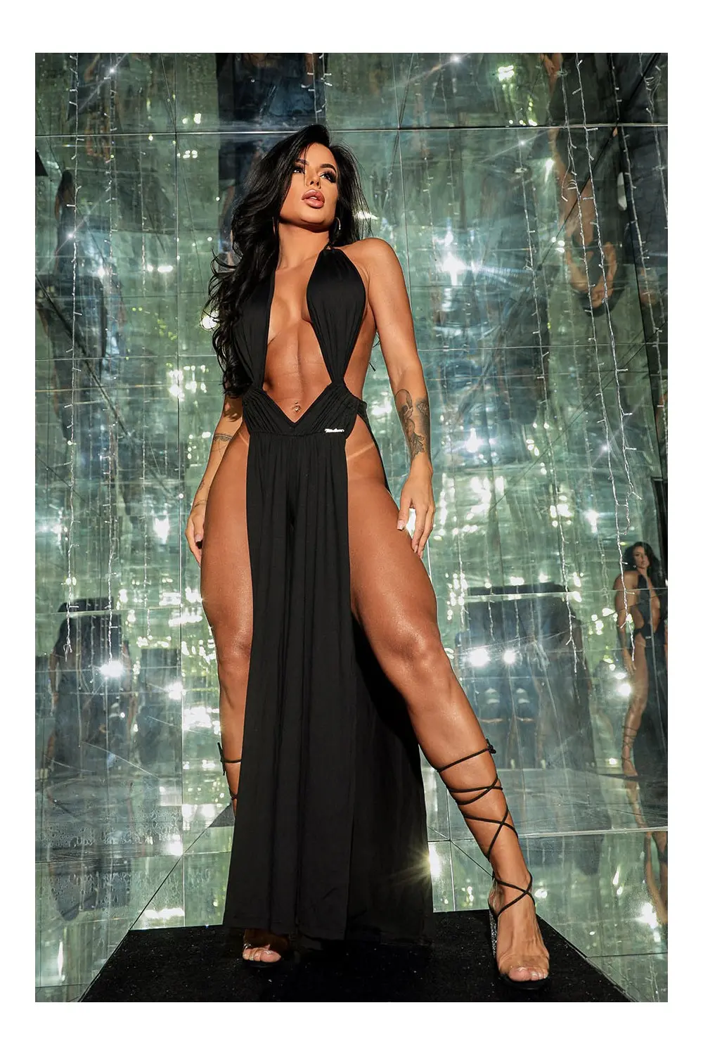Features: Black jumpsuit with slits, low-cut at the top and open at the back.