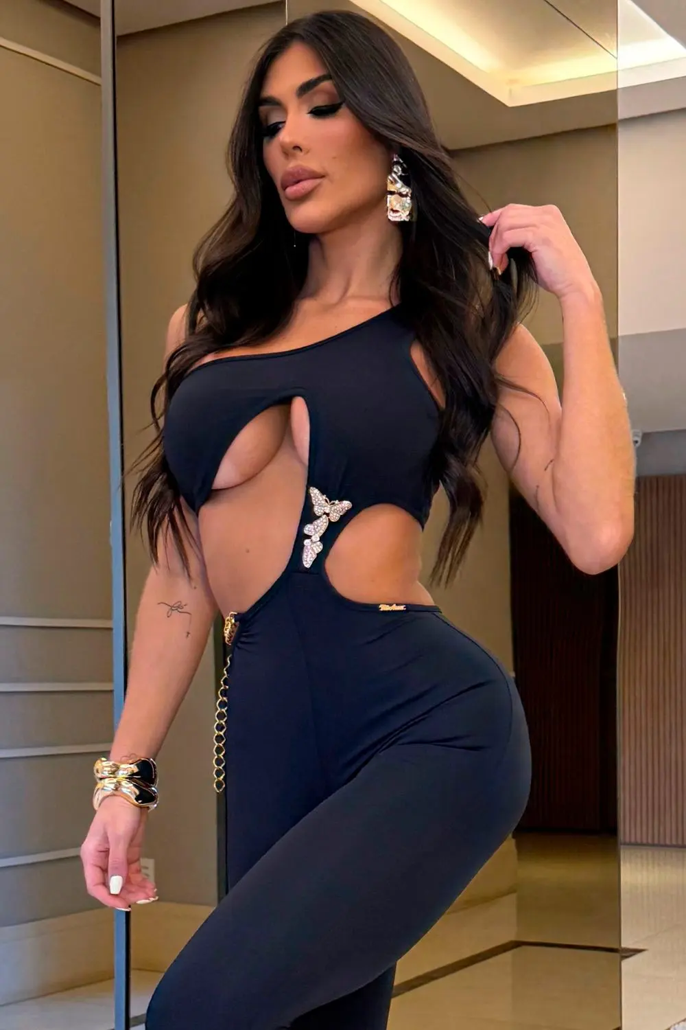 Jumpsuit in fitted fabric with an asymmetrical design and striking cutouts that flatter the body. Gold details and butterfly appliqués add a luxurious touch, ideal for impactful evening looks.