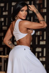 Introducing our chic white set that's designed to make a statement! This dynamic duo includes a top with a single thick shoulder strap for a unique touch of style. Paired with a long skirt featuring a wide decorative opening that elegantly showcases your right leg, this set is the epitome of sophistication and boldness.