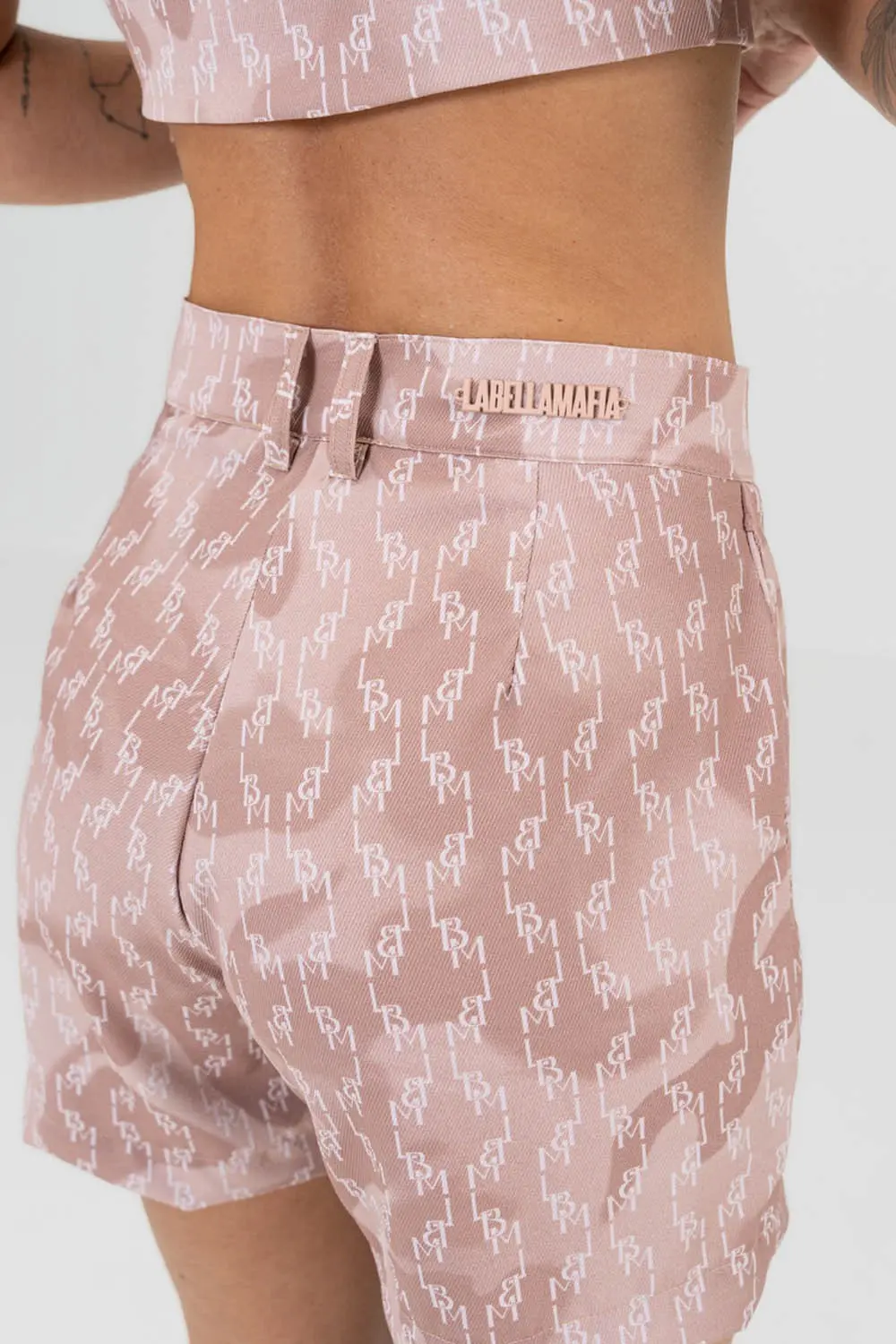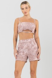 Get ready to turn heads in our light pink set, where style meets comfort! This playful ensemble features a lively white graphic print pattern that adds a touch of fun to your look. The top comes with thin shoulder straps and a decorative opening under the bust, giving it a trendy edge. Paired with matching shorts adorned with decorative belt straps and pockets, this set is as practical as it is stylish.