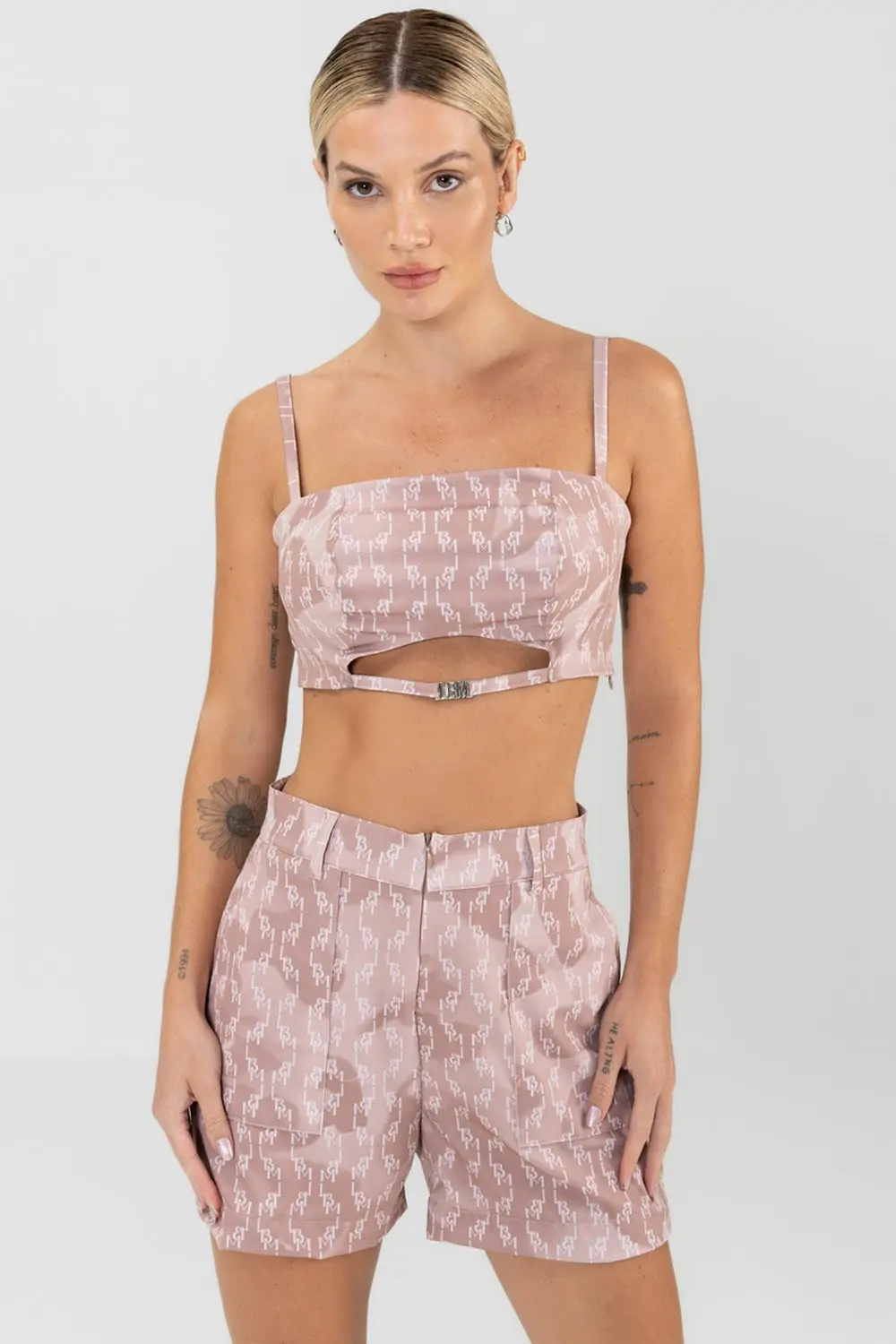 Features: A light pink set made in a white graphic print pattern over the entire piece, and is composed of a top with a decorative opening under the bust and thin shoulder straps and a pair of shorts with decorative belt straps and pockets.