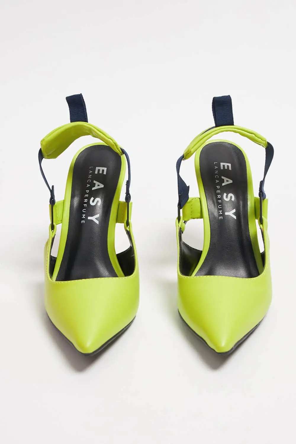 Characteristics: green thin heel pumps with open sides, with elastic to hold the foot.