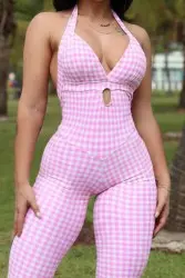 Revamp your wardrobe with this chic checkered pink jumpsuit! Featuring a wide neckline with an alluring opening underneath, it's a trendy twist on a classic design. Step into style, and let your confidence shine with every step.