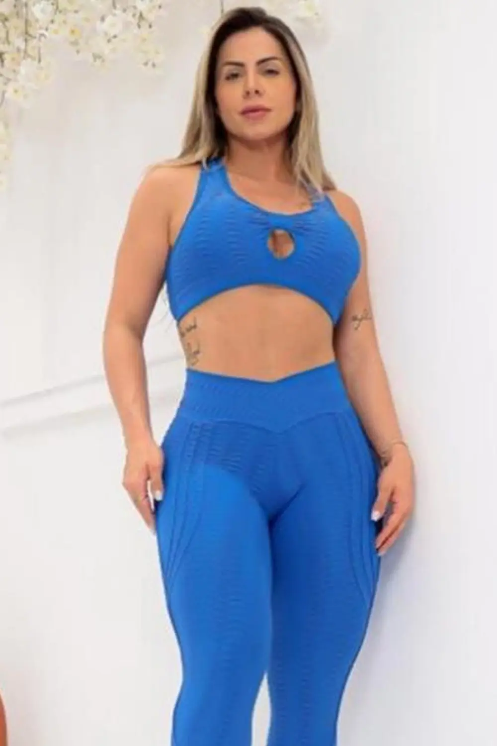 Features: Blue texturized fitness set, composed of a low cut cropped top with a decorative opening in front of the bust, and a pair of leggings with a high waistline.