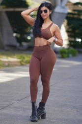 Long brown set with body-hugging fabric. The leggings have a high waistband that provides firmness and security and lifts the butt. The top has medium straps with an open back and strips, bringing more charm and delicacy to the look.