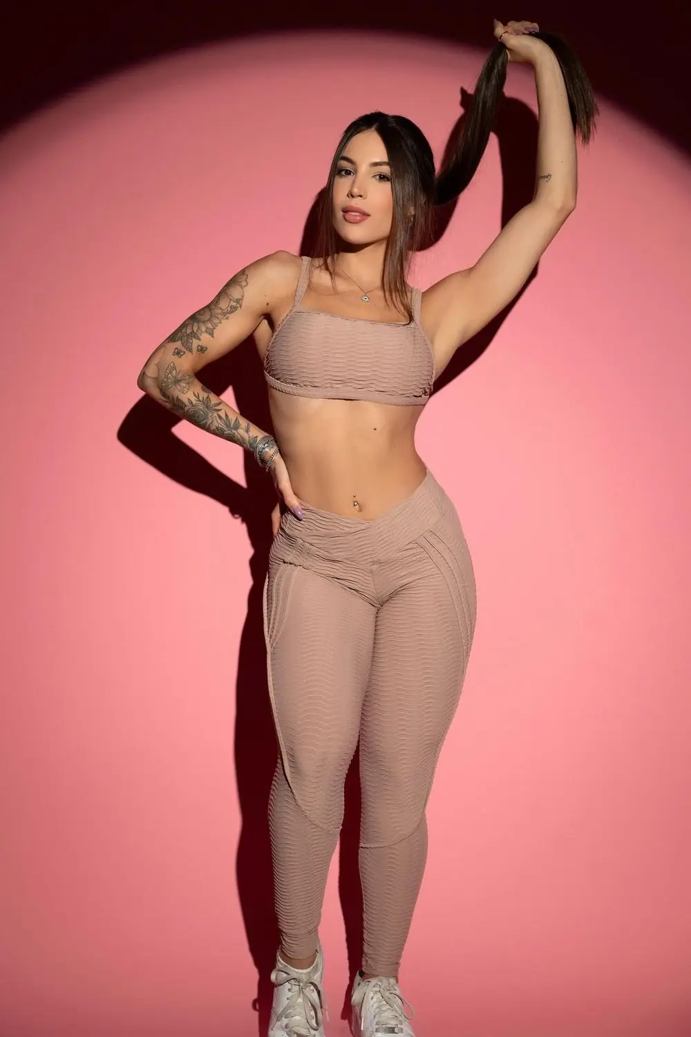 Nude-toned brocade fitness set consisting of a top with thin straps on the shoulder and a thin strap on the back, giving the look more charm and freshness with an open back. The leggings have a high waist and BUTT-LIFT, which highlights the curves of the body, in addition to designed seams that add more grace to the look.