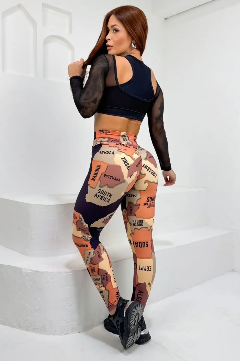 This fitness set features a black top with strategic cutouts and long tulle sleeves, offering a modern and sophisticated look with a touch of sensuality. The high-waisted leggings feature a world map print with a focus on the African continent, creating a unique and authentic design. Made from high-compression fabric, they provide support and comfort during workouts, while also flattering your figure with style. Ideal for those seeking performance combined with attitude.