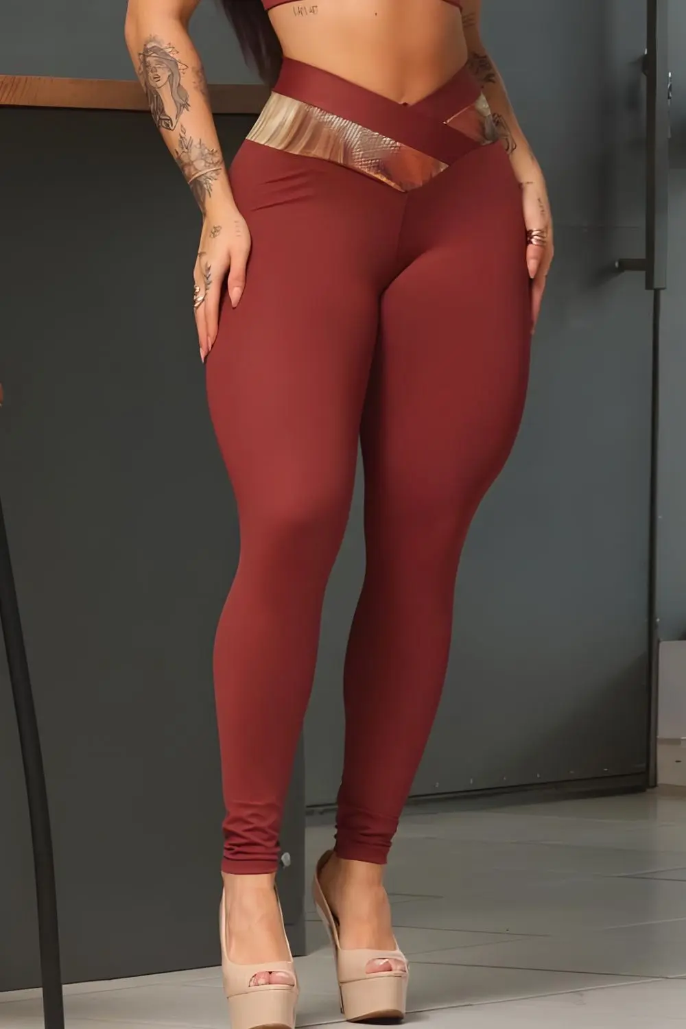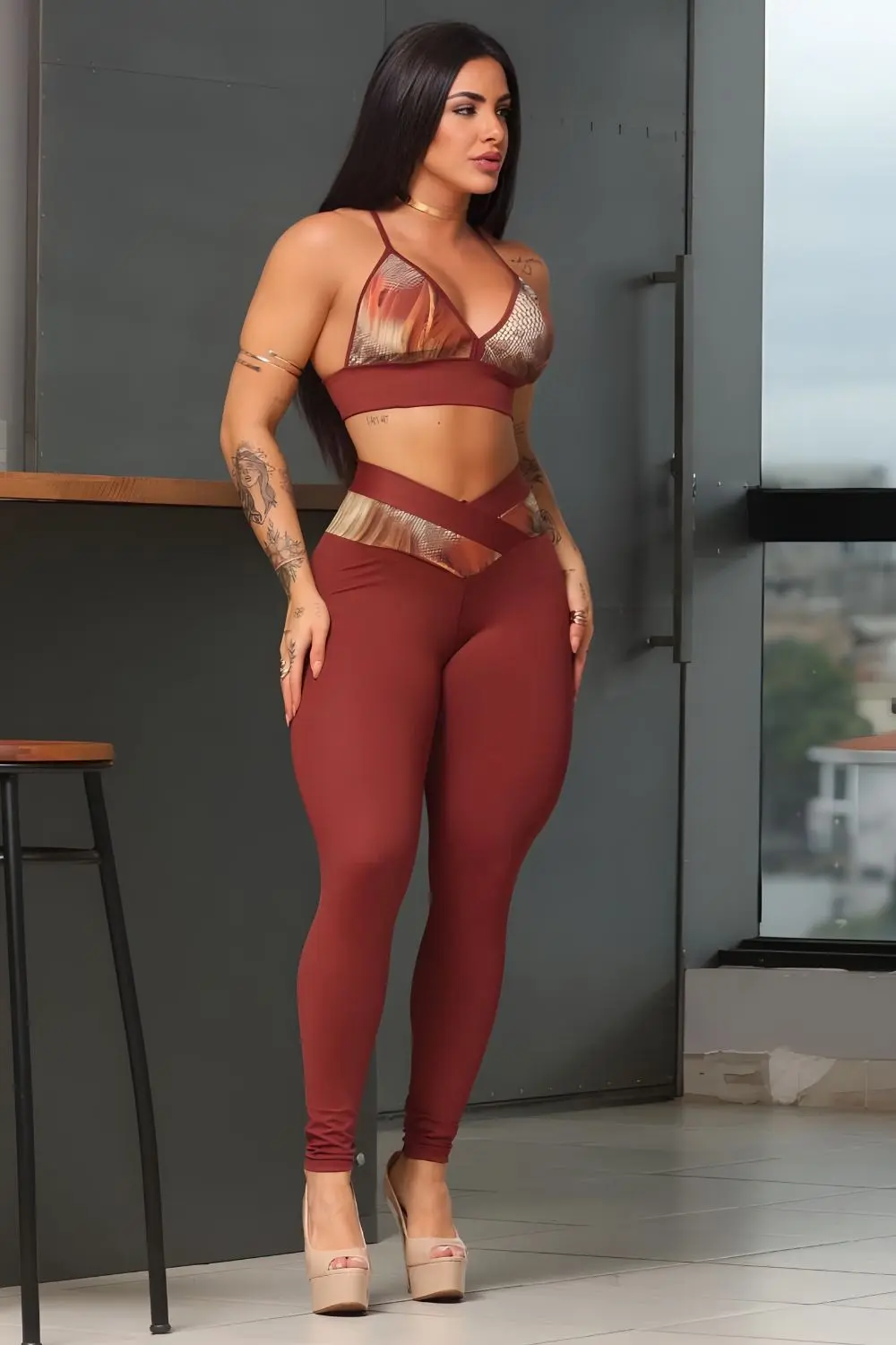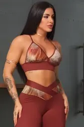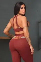 Brown fitness set consisting of a top with an anatomical design that adjusts to the body and high-waisted leggings that define the silhouette. The set offers comfort, elasticity, and freedom of movement, ideal for workouts and a modern sporty look for everyday wear.