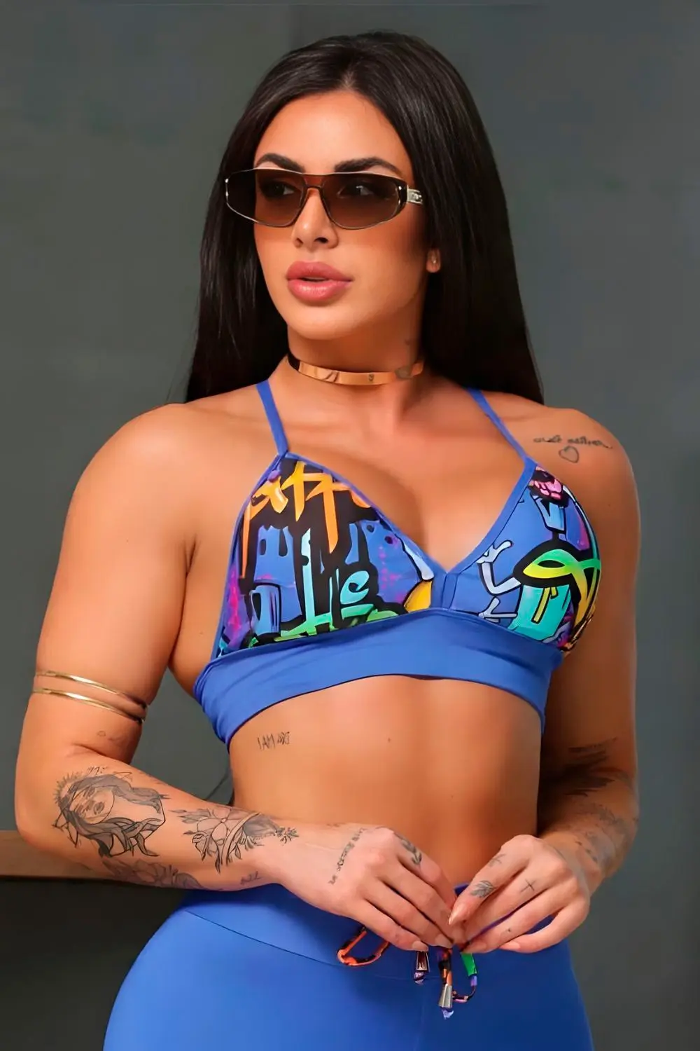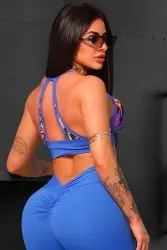 Blue fitness set with printed top and high-waisted leggings, which flatters the silhouette, offers comfort, a firm fit, and freedom of movement, combining performance and style.