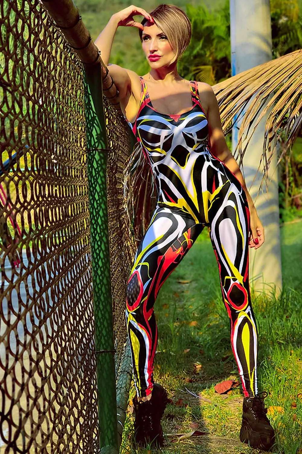 This jumpsuit is vibrant and futuristic, with a design that mixes geometric shapes and contrasting colors in black, white, yellow and orange. The pattern creates a dynamic look, with lines that highlight the curves of the legs. The predominantly black background intensifies the bright colors, giving a striking visual effect. The fabric is fitted to the body, providing comfort and a modern style, ideal for sports activities or bold casual looks.