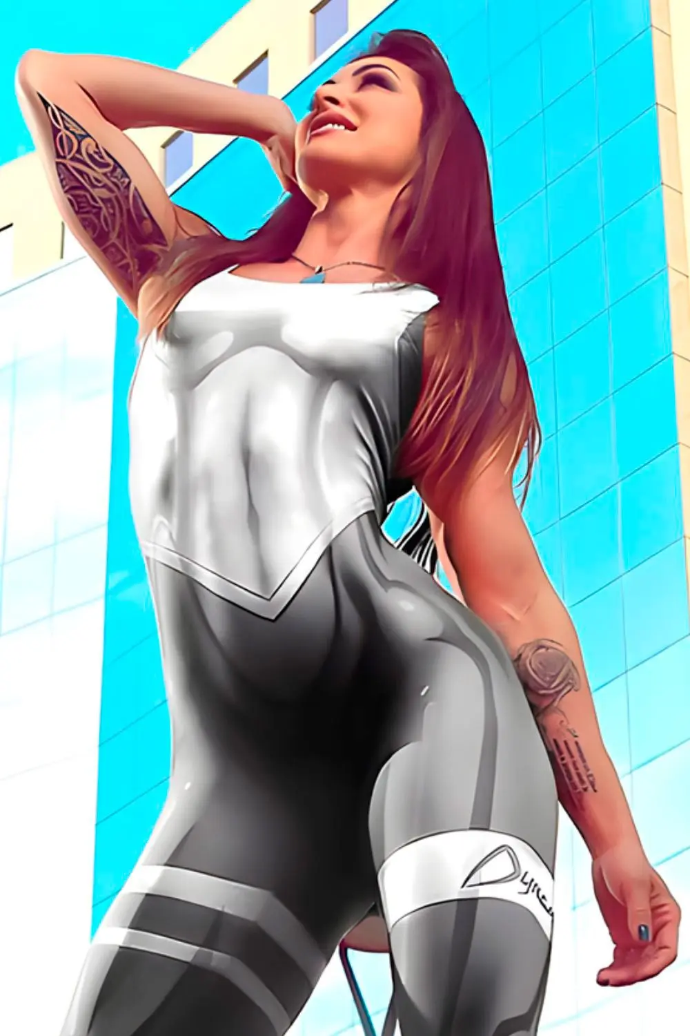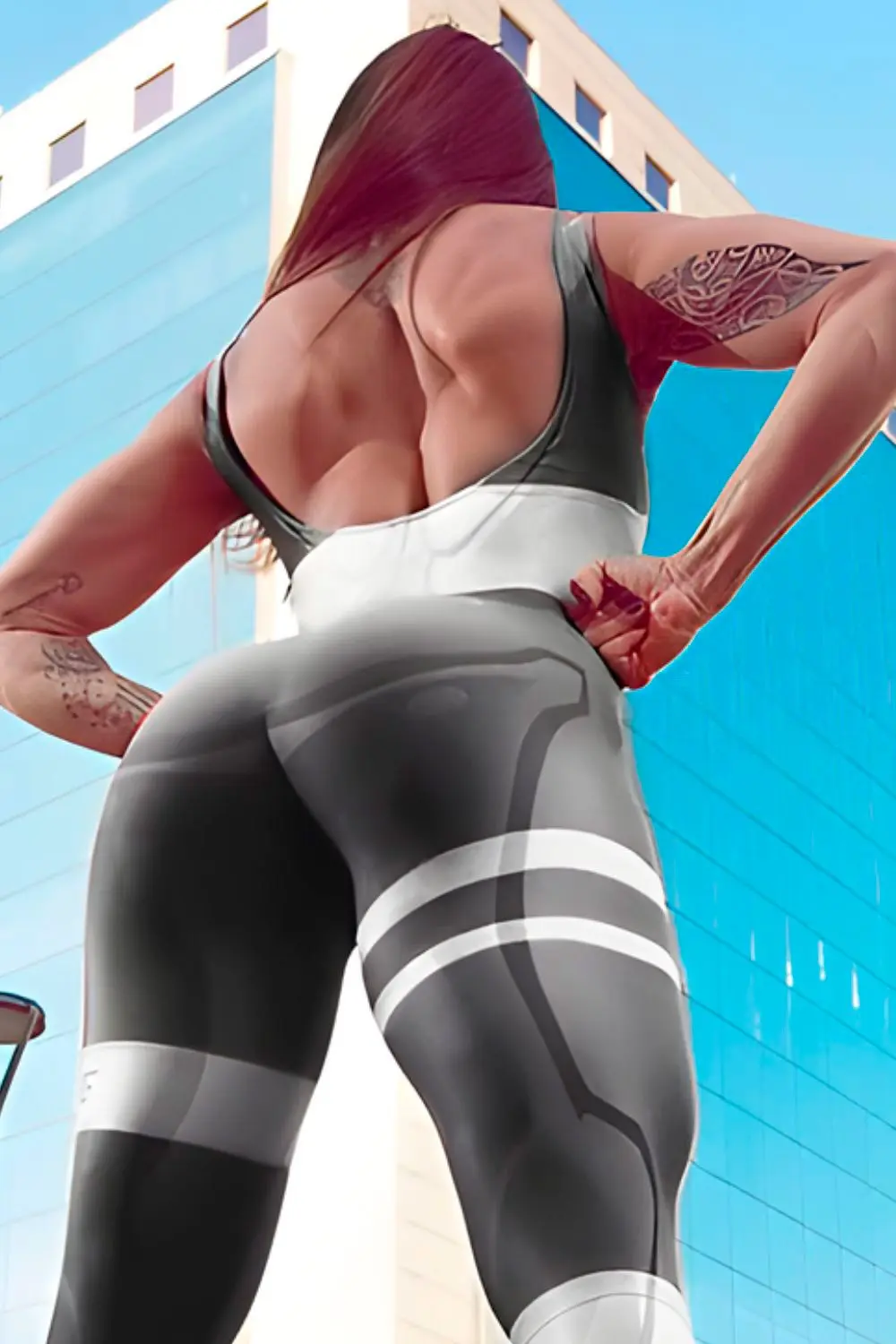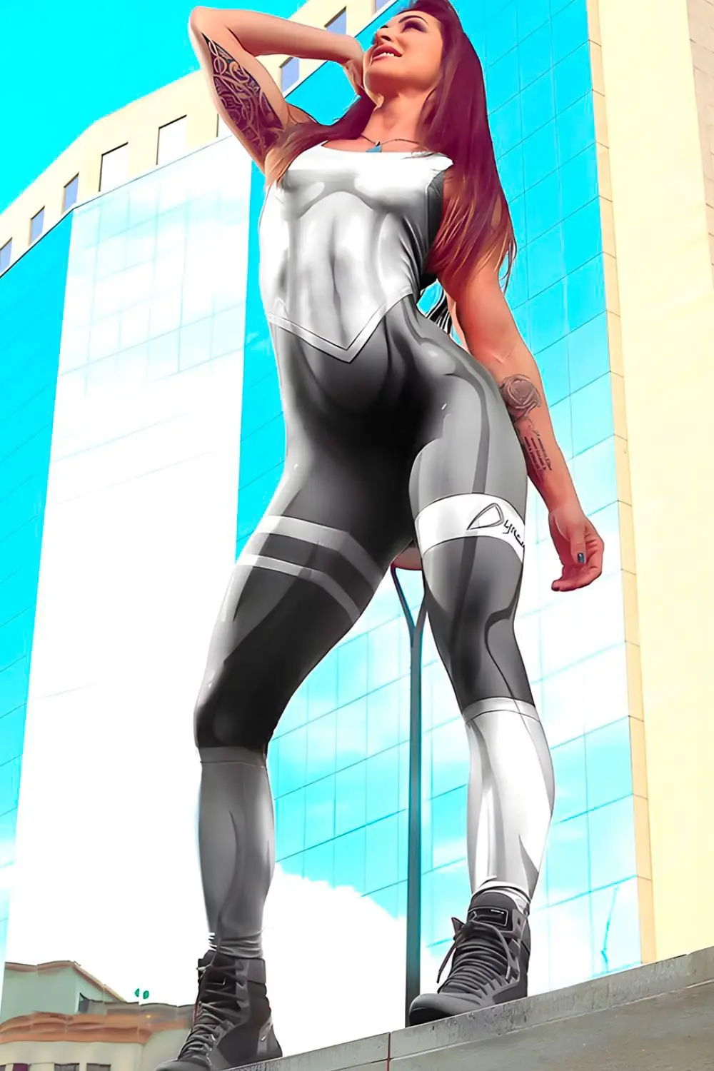 The Black and Silver Fitness Jumpsuit features an original 3D print that elegantly shapes the silhouette, highlighting feminine beauty in any movement.