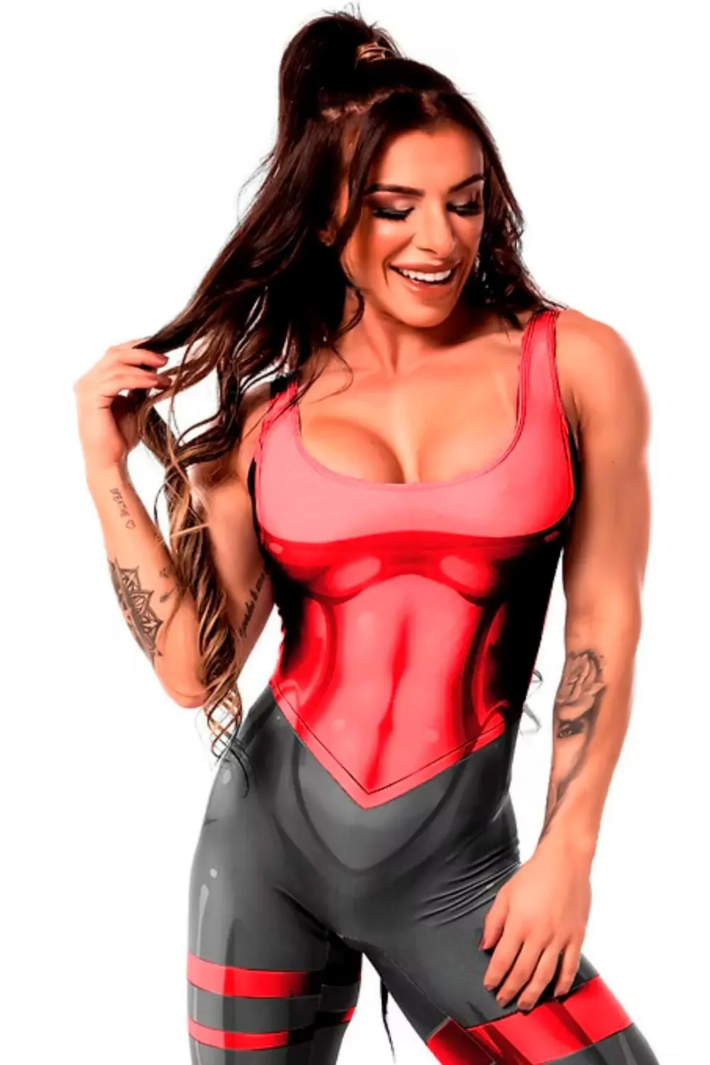 The Black and Red Fitness Jumpsuit features an original 3D print that elegantly shapes the silhouette, highlighting feminine beauty in any movement.
