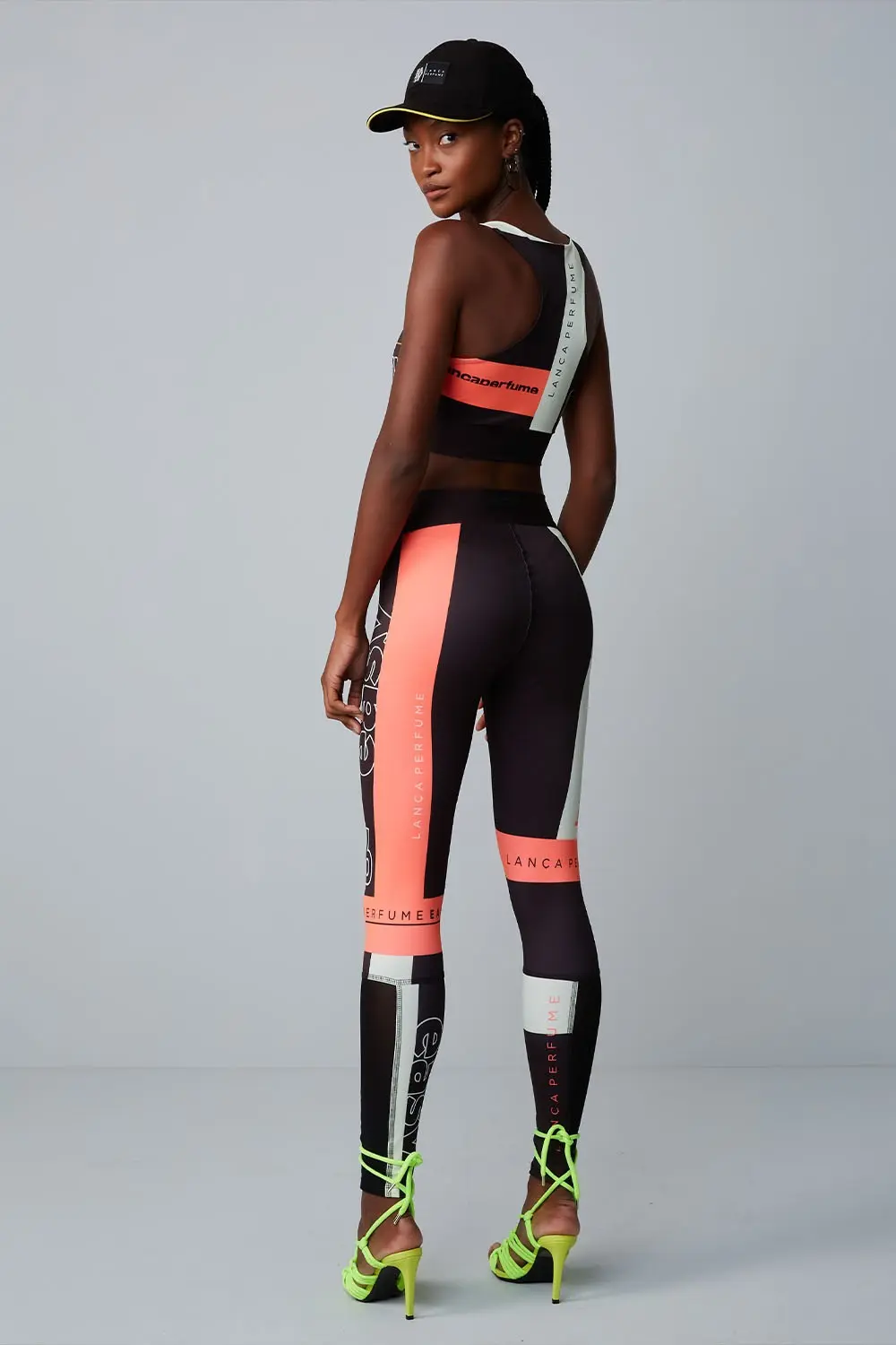 Features: Black leggings with salmon cutouts and black and white prints.