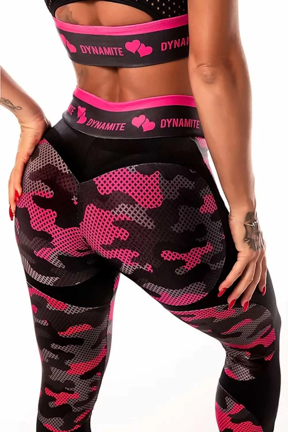 Features: Apple booty model leggings, which enhances the curves. Printed in pink. With custom dynamite waistband.