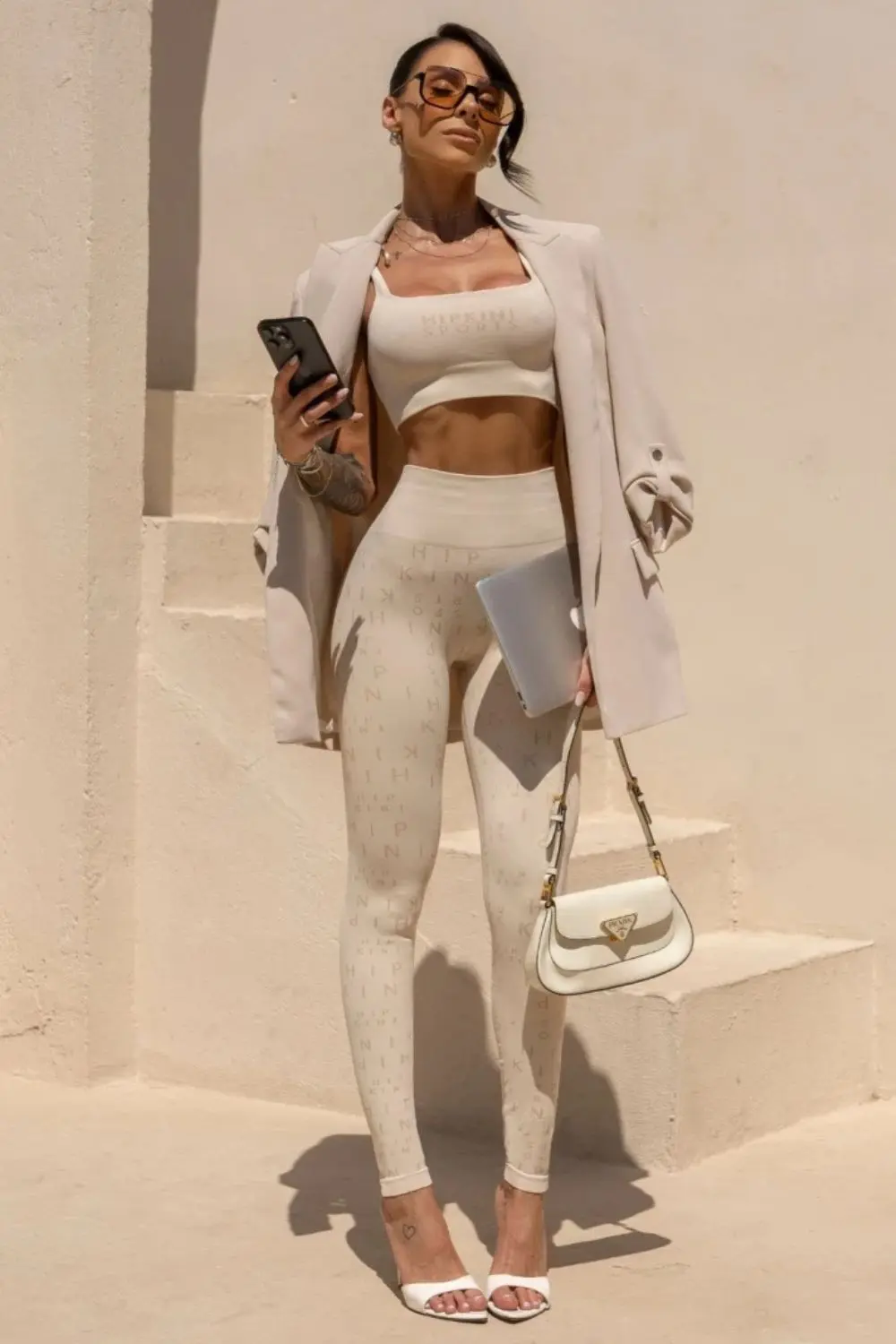 Beige leggings with a subtle letter print, a high-waisted waistband, and high-compression fabric. Ideal for workouts and casual outfits, they combine comfort and minimalist style.