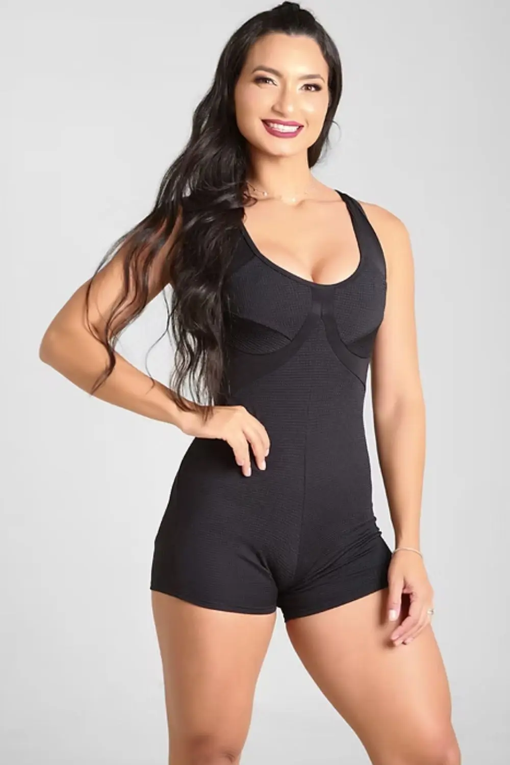 Black fitness jumpsuit with a fitted design that enhances your curves and ensures comfort during your workout. It features wide straps, an anatomical neckline, and a strategic cutout that enhances your silhouette. Made from high-stretch fabric, it offers support, freedom of movement, and a modern style.