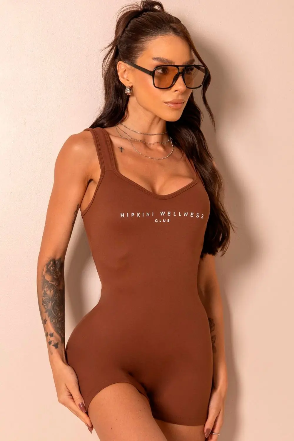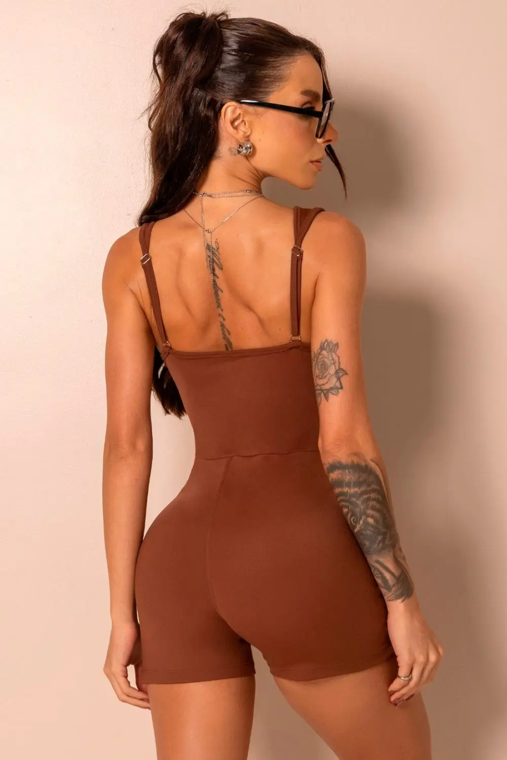 Caramel Coffee romper with white bias trim detailing your body's silhouette, accentuating curves, and wide straps for added support.