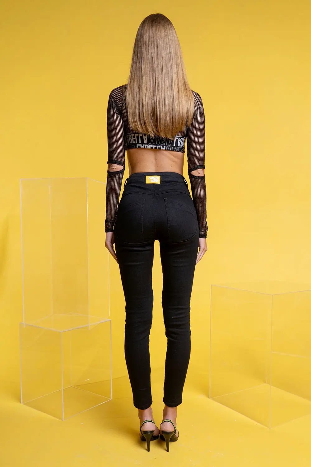 Features: Pants made of black jeans, with a cutout on the back that enhances the butt. It has fake front pockets and back pockets. With button closure and front zipper. It has yellow rubber plate on the back.