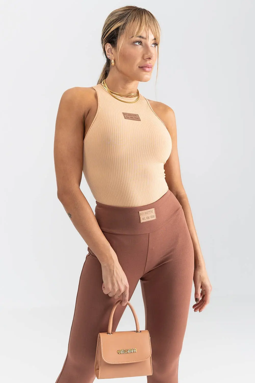 Description: Looking for the perfect leggings that are both comfortable and stylish? Look no further! These brown leggings are designed with vertical cuts on the cuffs to give your outfit a unique edge, and the rubbery label on the front adds an extra touch of personality. Made with a soft and stretchy fabric, these leggings are perfect for any occasion